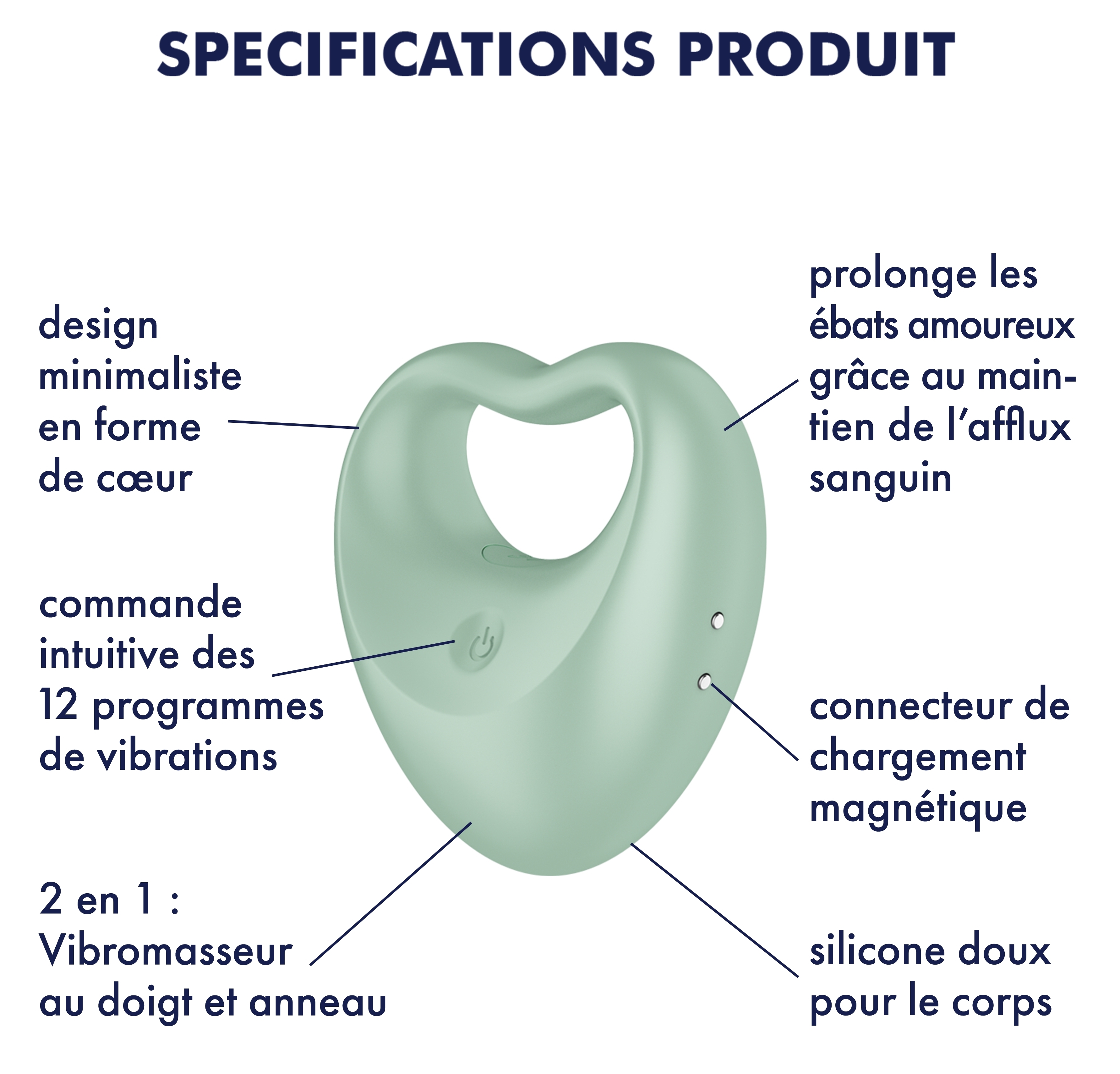 Caractéristiques : Matière silicone Batterie Lithium – recharge USB Dimensions : 6 x 6 x 3cm Garantie 15 ans