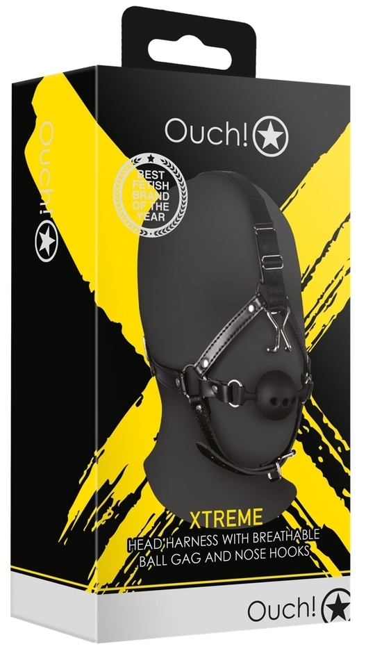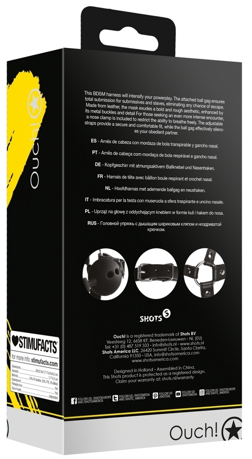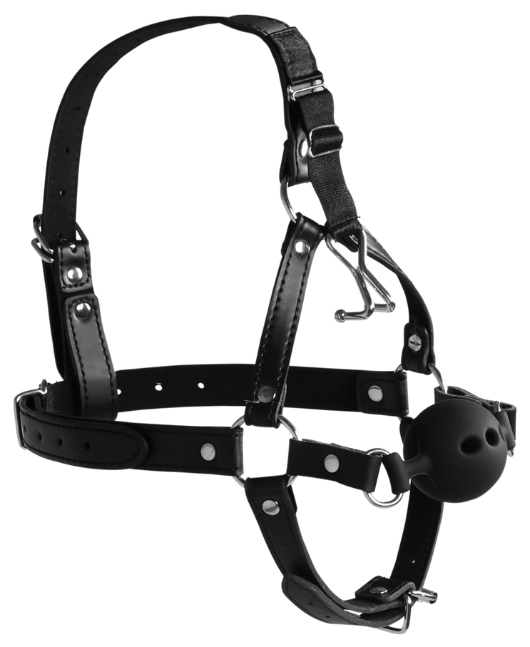 Bâillon avec une boule percée en TPE et de 4 cm de diamètre. Crochet nasal en métal de 4.5 cm de long. Sangles ajustables en simili de 2 cm de largeur.