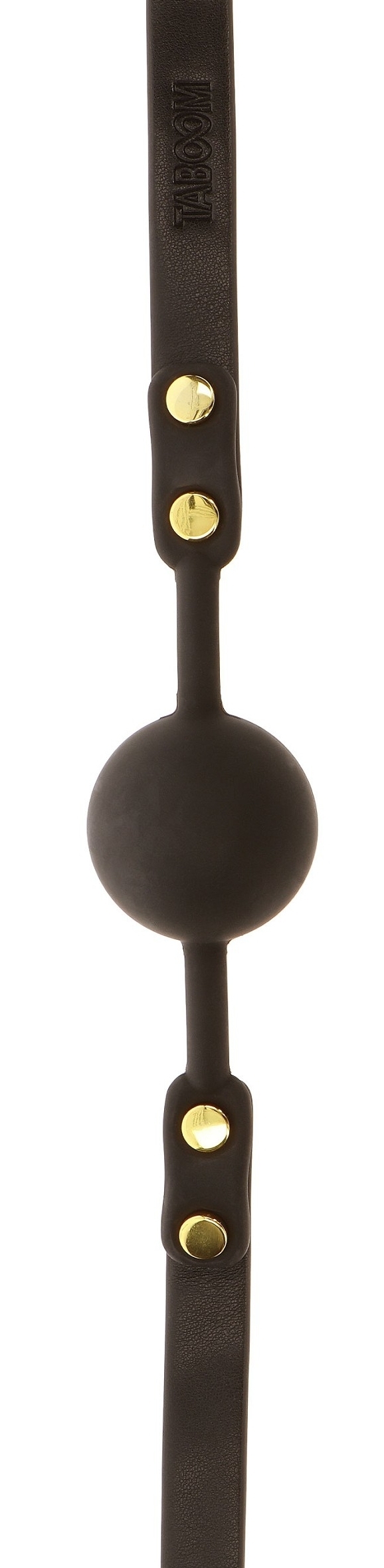 Bâillon noir avec une boule de 4 cm de diamètre. Attaches et sangles dorées. Sangle ajustable de 47 à 60 cm. Boule en silicone. Sangles en simili (polyuréthane).
