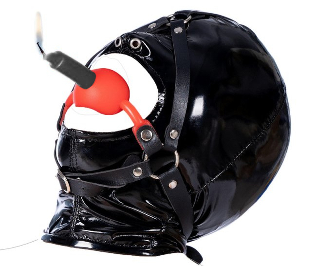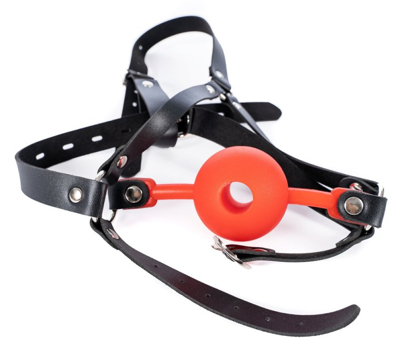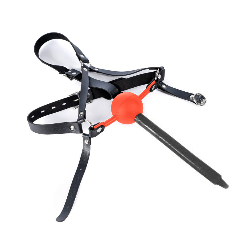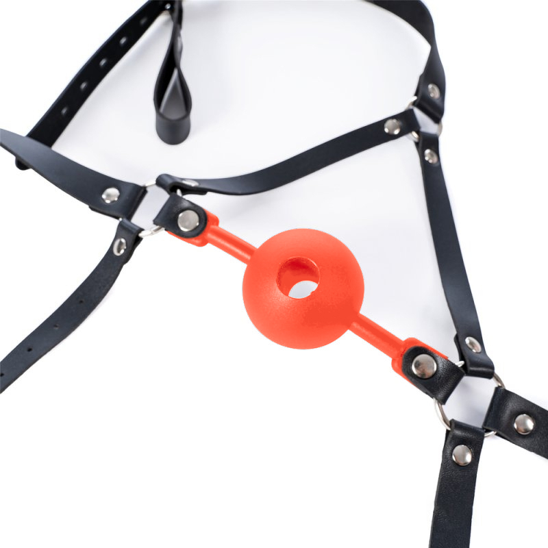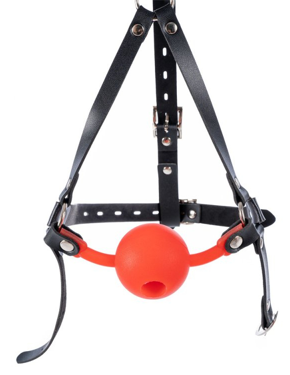 Bâillon-boule percé rouge, avec boule de 49 mm, percé sur 13 mm. Sangle ajustable de 44 à 59 cm (tour de tête).En simili noir avec boule en silicone.Cagoule non incluse.