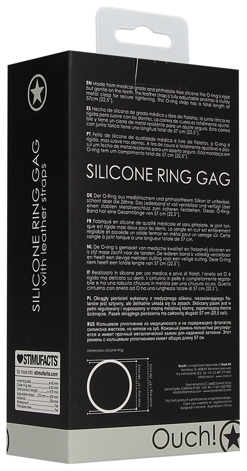 Bâillon en silicone de 40 mm de diamètre empêchant le ou la partenaire de fermer la bouche par un anneau rigide, tout en assurant au porteur confort et sécurité. Dimensions : Sangle : 57 cm, ajustable de 36 à 54 cm Bâillon : 40 mm