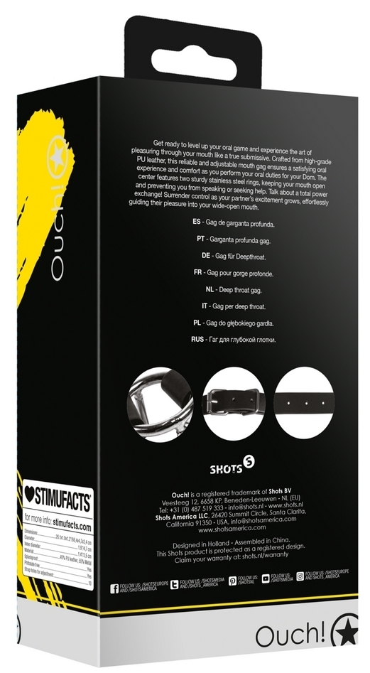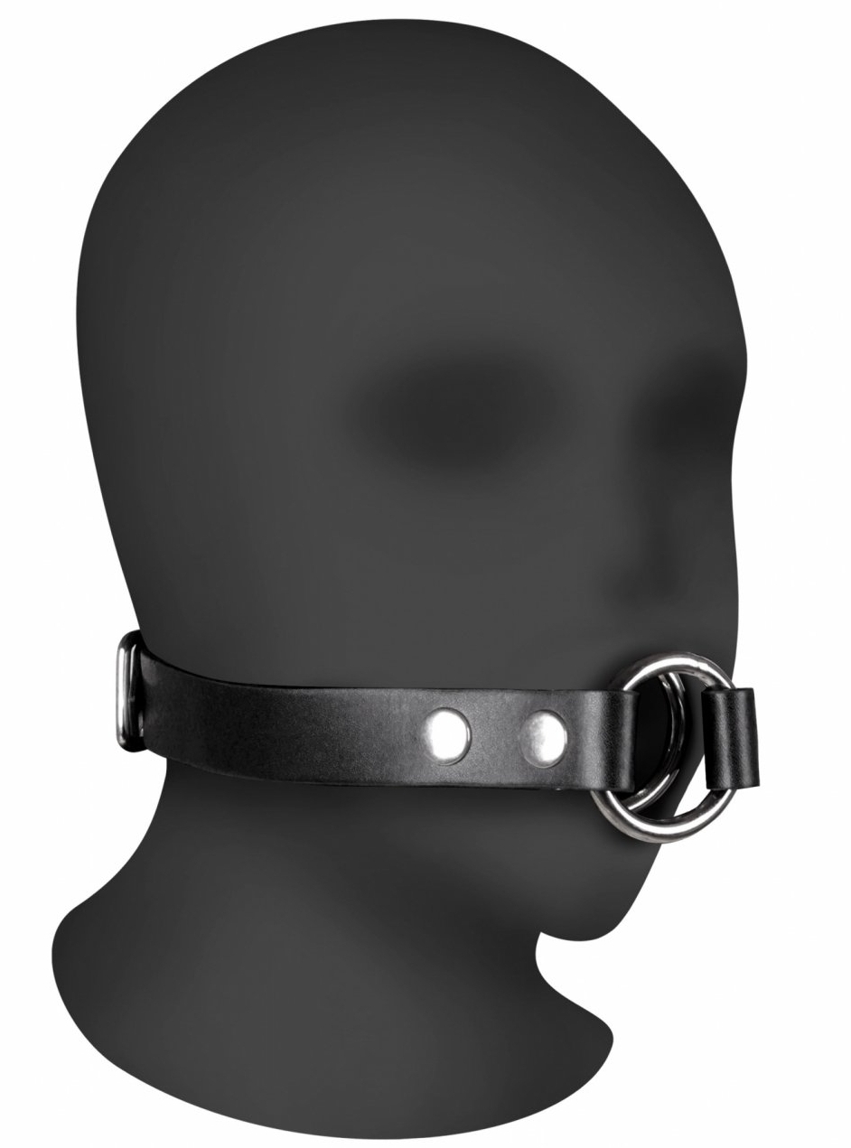 Bâillon sous forme d’un double anneau en métal de 37 mm pour effectuer des gorges profondes.La profondeur est de 3.5 cm. Sangle ajustable en simili pour un bon maintien au niveau du visage. Longueur totale de la sangle : 66 cm. Avec 10 trous d’ajustement.