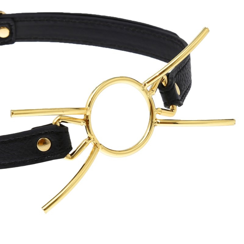 Bâillon noir et doré avec un anneau central de 38 mm.Les branches font 5 cm de longueur. Tour de tête de 47 à 65 cm. En simili