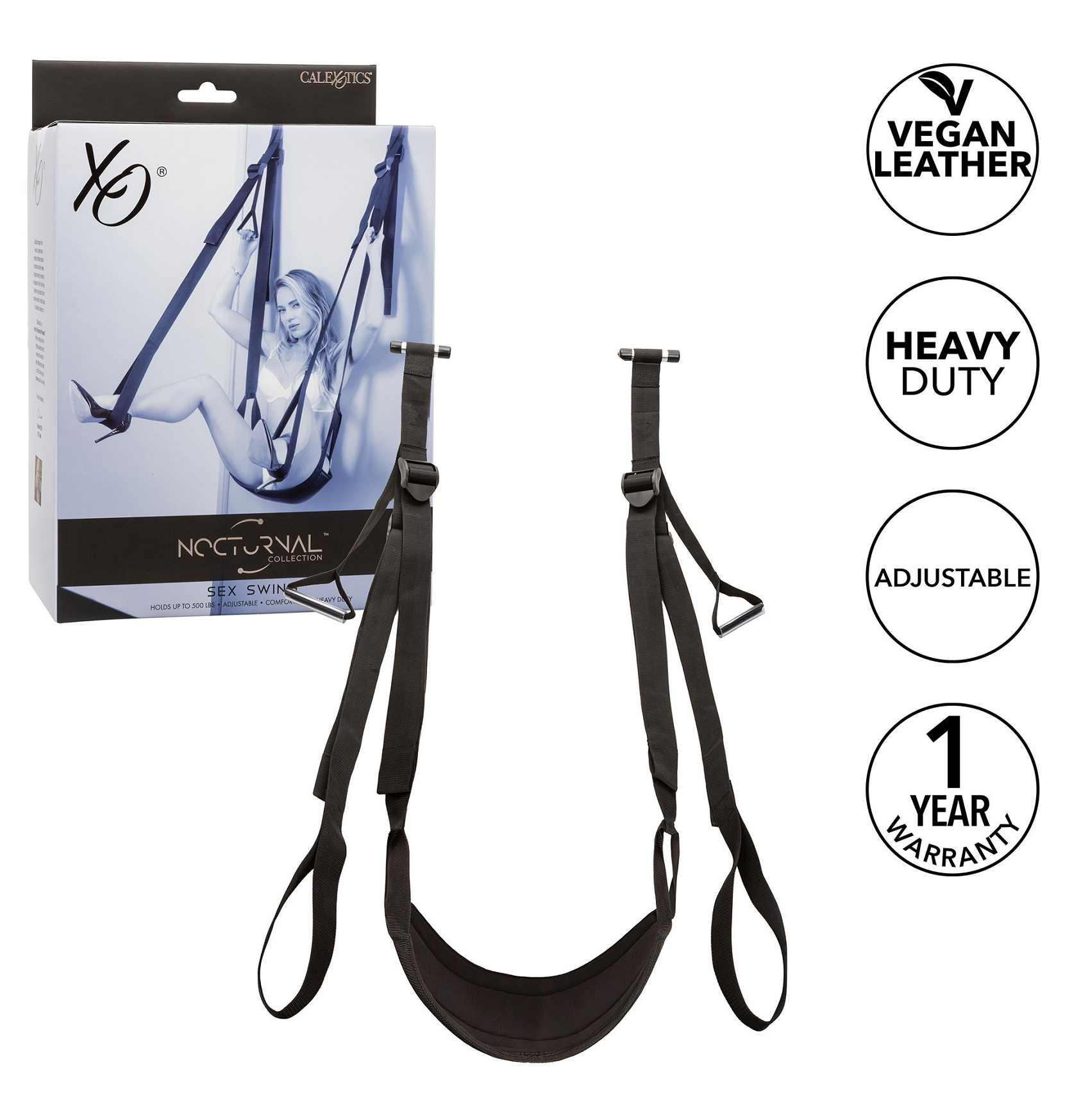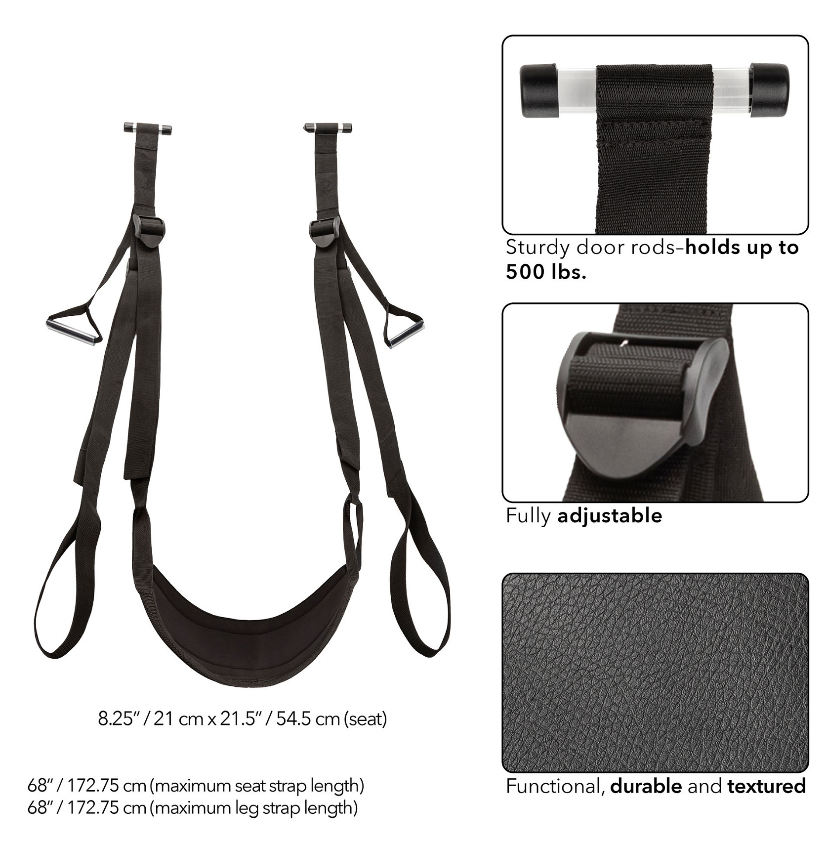 Balançoire de porte avec sangles ajustables.Assise de 21 cm de large pour 54.5 cm de long.Poids maximal de 225 kgEn simili noir.