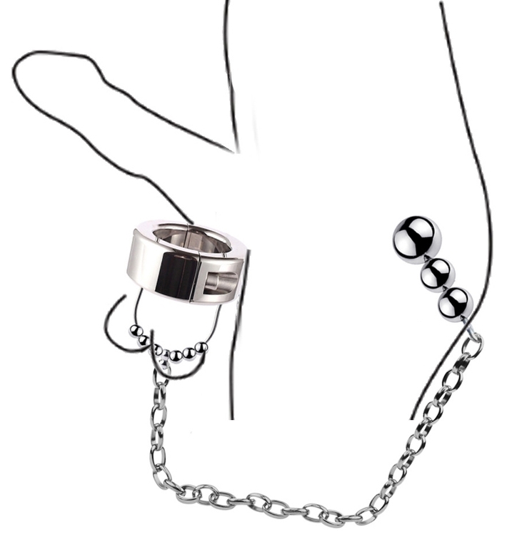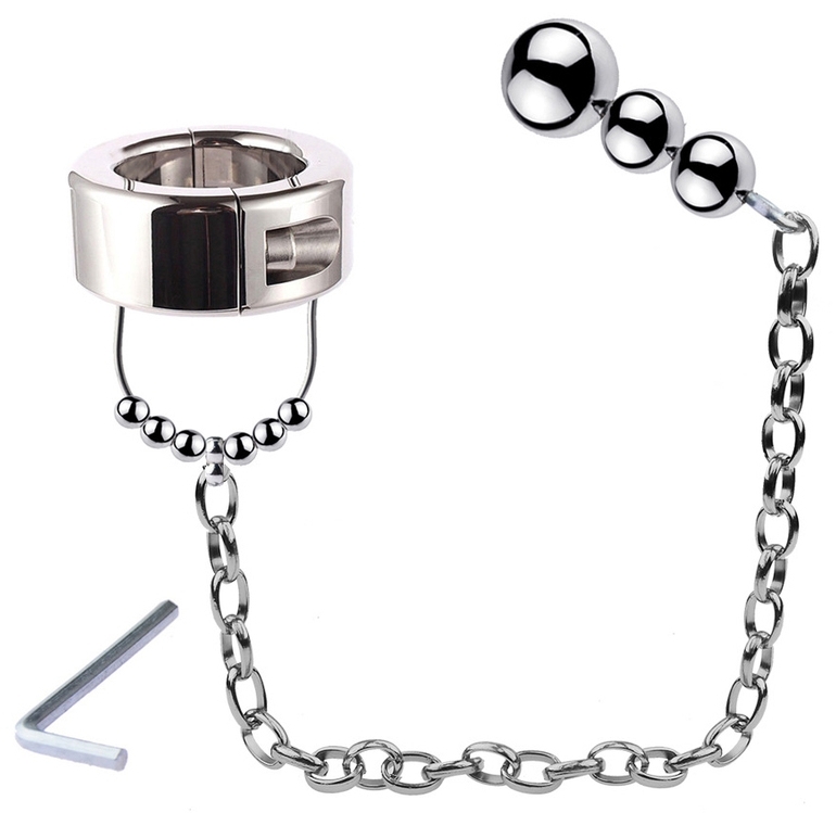 Le ballstretcher en métal Cbt Ass possède aussi un plug sous forme de plusieurs boules. Le plug mesure 6 x 2.5 cm.L’anneau a un diamètre de 36 mm, une largeur de 25 mm et un poids de 250 grammes. Poids total de 400 grammes lorsque les 3 boules se laissent pendre. Fermeture avec une clé allen
