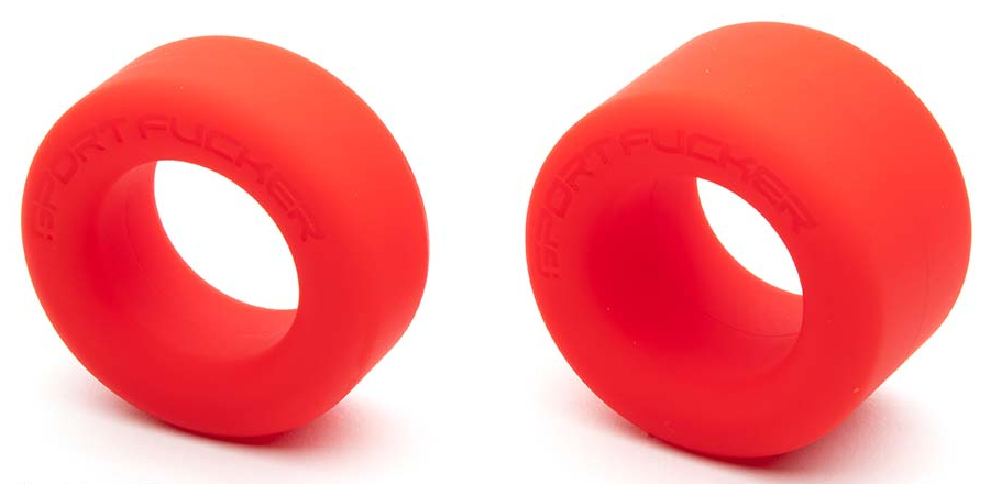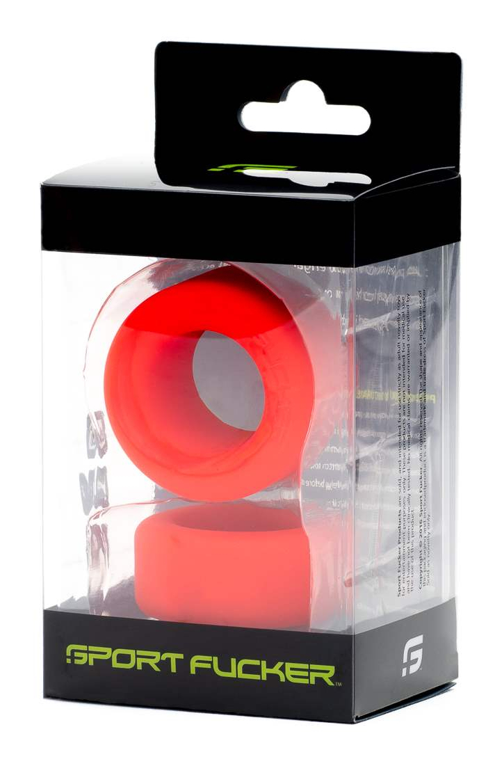 Ballstretcher rouge avec un diamètre intérieur de 25 mm légèrement étirable pour le positionner.Hauteur de 20 mm et de 30 mm pour les anneaux. À placer à la base du pénis et au-dessus des bourses.
