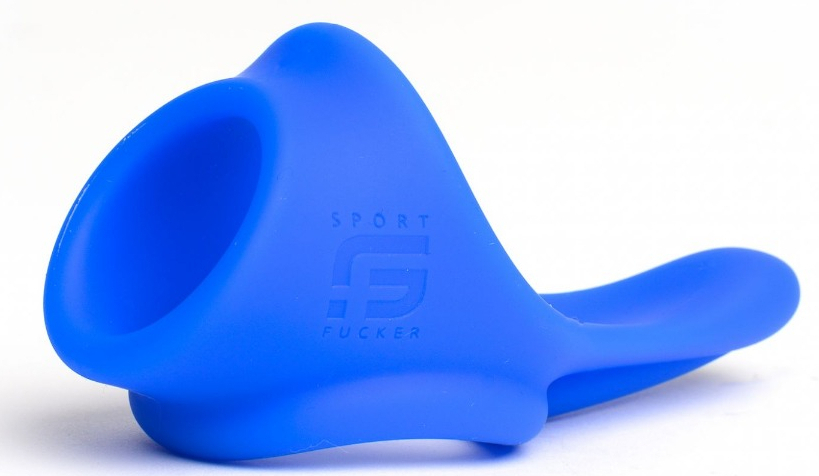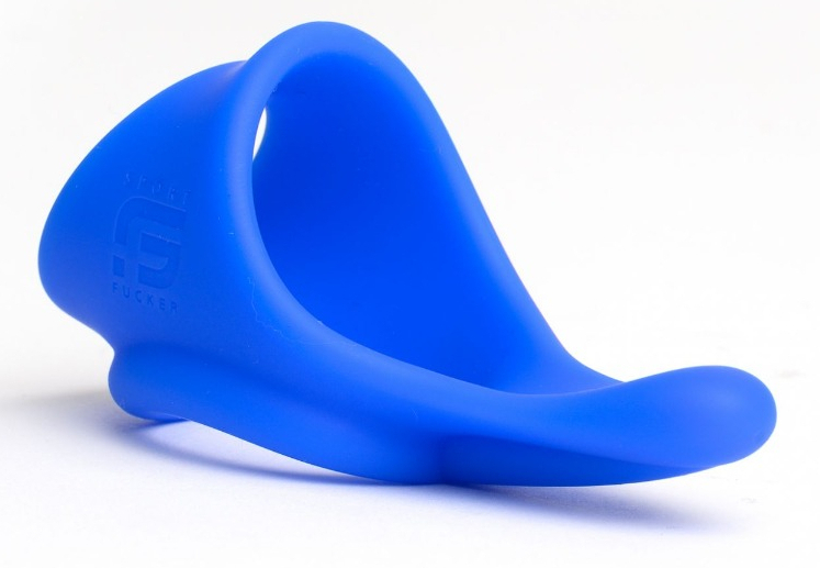 Ballstretcher bleu avec une forme ergonomique. Ouvertures pour le pénis et les bourses d’environ 30 mm. En silicone + TPR