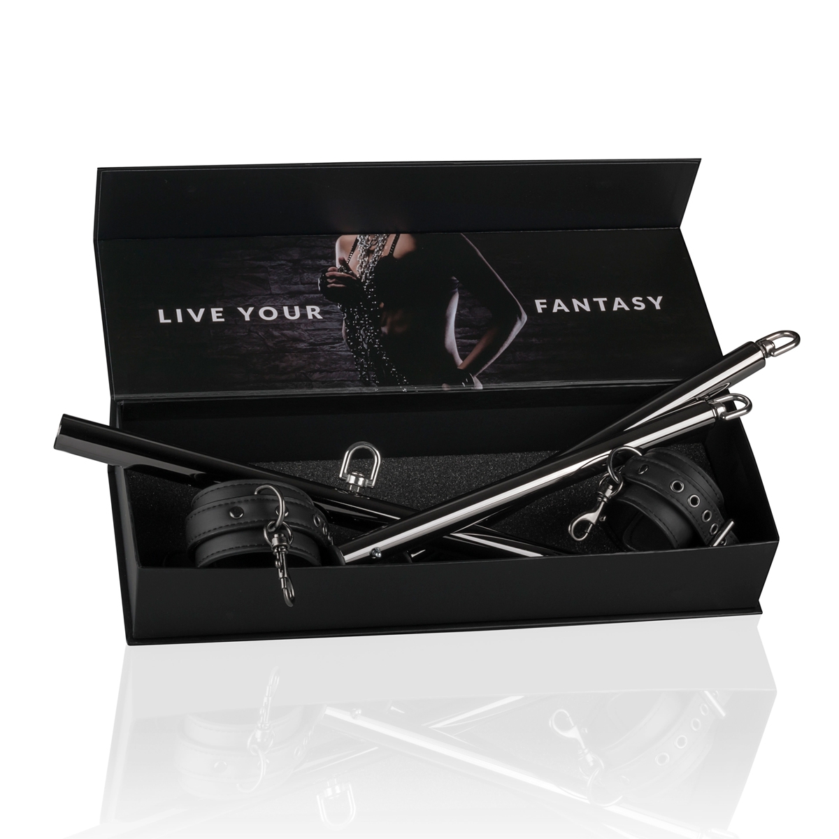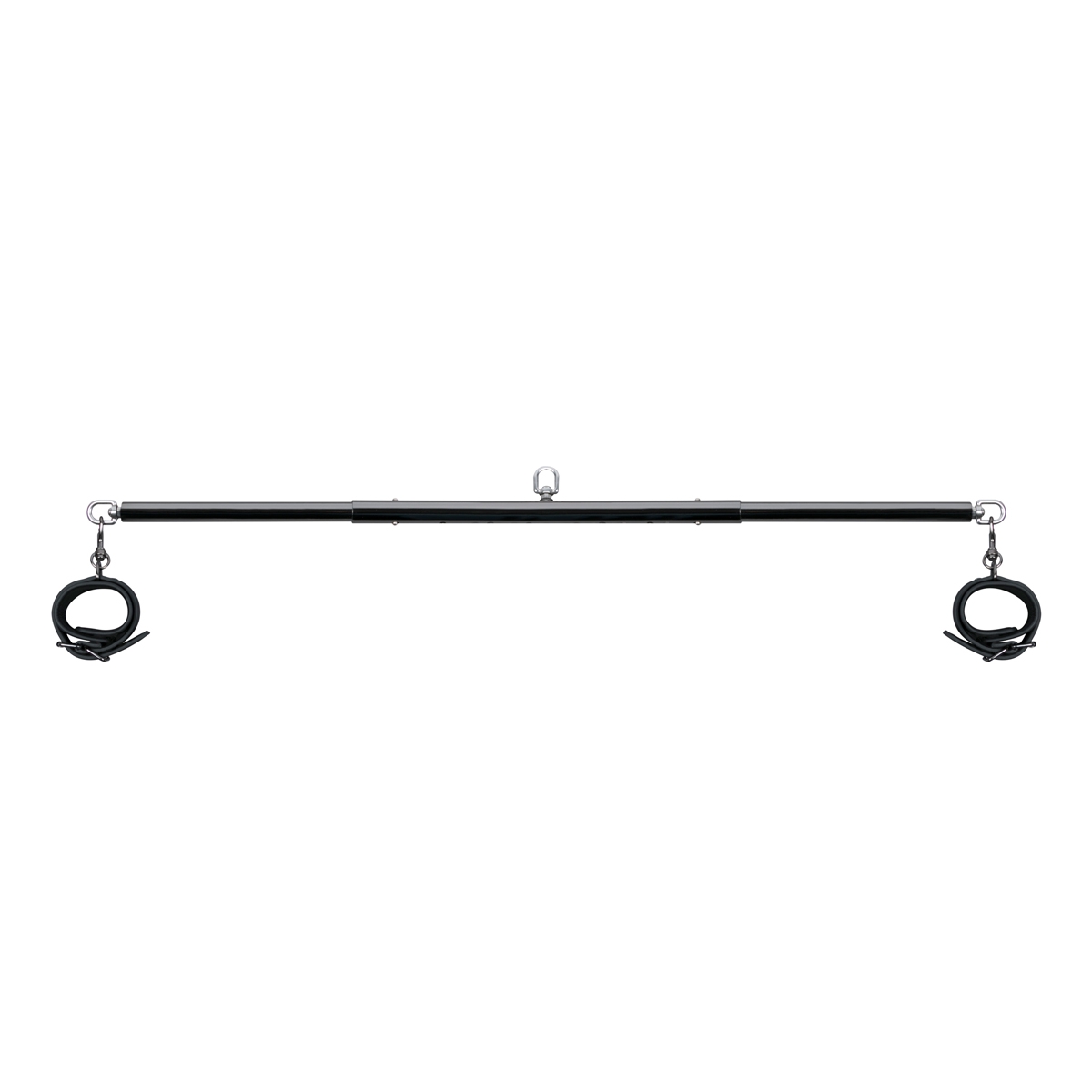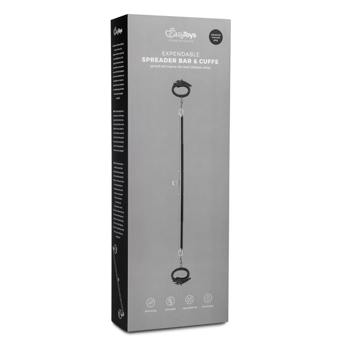 Cette barre ajustable est idéale pour les moments SM. Elle possède une longueur allant de 76 à 96cm.Les menottes sont en simili (polyuréthane) et s’ajustent également. Accessoire parfait pour laisser le partenaire dans une position soumise