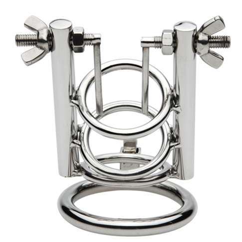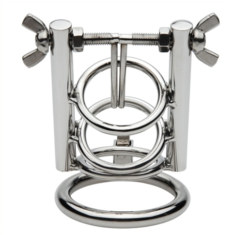 Cette cage de chasteté est conçue avec une longueur de 6cm et des anneaux de 3cm de diamètre.Elle permet d’encager le pénis du partenaire et d’écarter l’urètre progressivement. En effet, l’ouverture peut aller de 6 à 25mm. Le premier anneau pour le maintien mesure 50mm de diamètre. Fermeture par cadenas. Fabriquée en métal acier inox