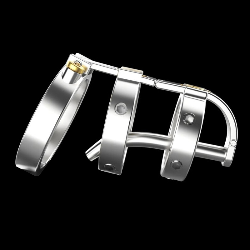 Cage de chasteté avec une tige d’urètre percée de 5.5 cm.La cage mesure 6.5 cm de longueur et 3.5 c de largeur.Elle possède des picots à l’intérieur pour apporter une dimension Sm. L’anneau de maintien est de 50 mm. En métal