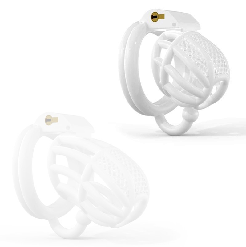 Cage de chasteté blanche avec une longueur de 5.5 cm et une largeur de 3.1 cm. Avec des anneaux de fixation de 40 mm, 43 mm, 46 mm et 50 mm. Fournie avec 2 clés pour retirer le mécanisme du verrou. En plastique ABS.