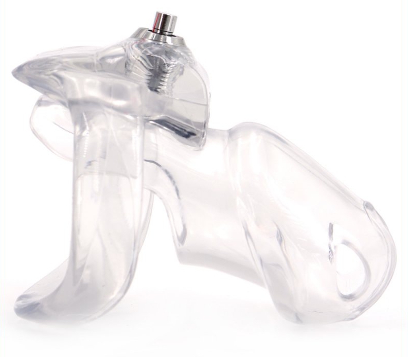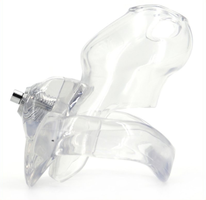 Cage de chasteté rigide transparente de taille L, de forme droite. Longueur de 9.5 cm. Largeur de 3.3 cm. En plastique ABS.