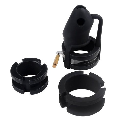 Cette cage de chasteté noire est conçue en silicone. Elle limite les possibilités d’érection et rend les séances de soumission excitantes et confortables. Elle est composée de 3 anneaux de 40mm, 45mm et 50mm de diamètre. La longueur est de 11cm. La largeur intérieure est de 3.2cm. Avec le cadenas et les 5 scellés numérotés