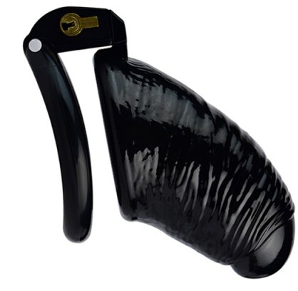 Cage de chasteté noire avec des contours réalistes.Longueur intérieure de 9 cm et largeur de 3.3 cm. Avec anneaux de 40, 43, 46 et 50 mm. En résine ABS.