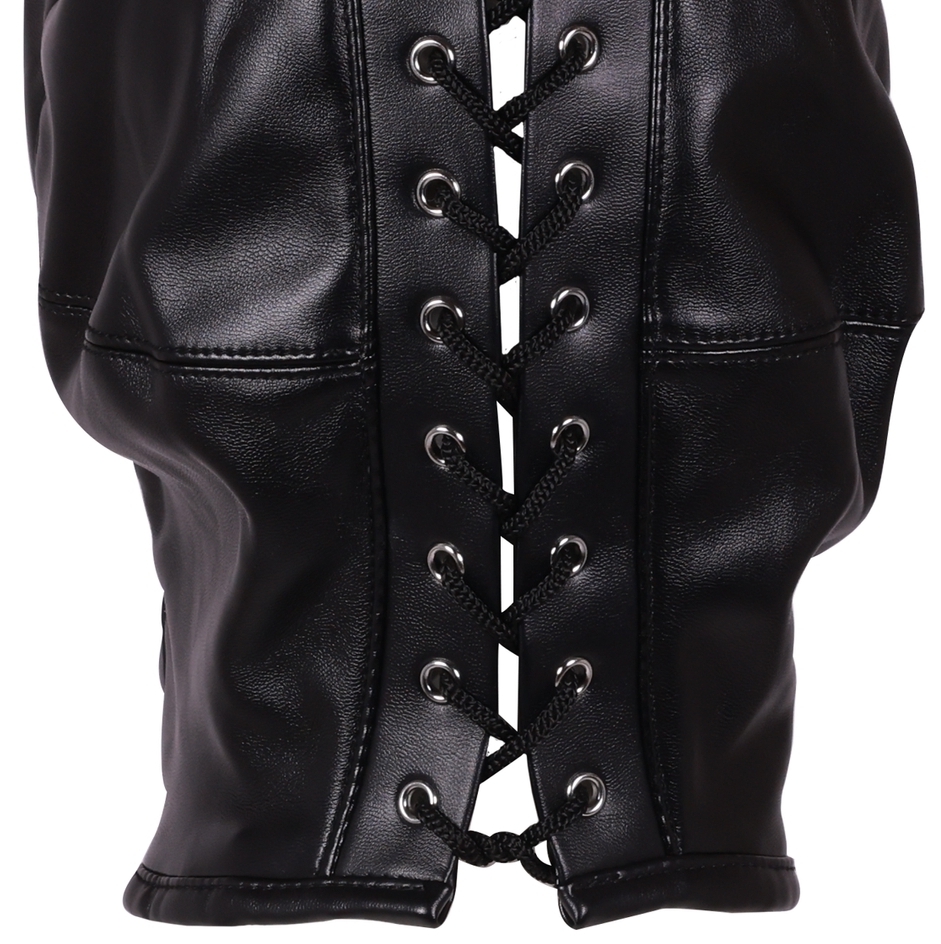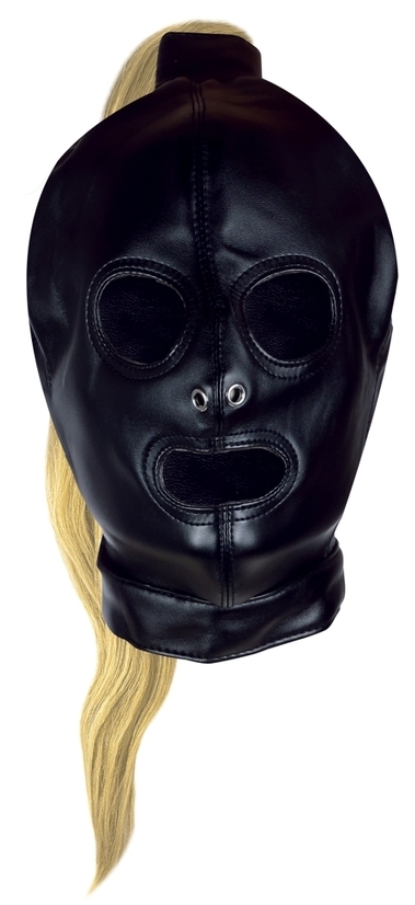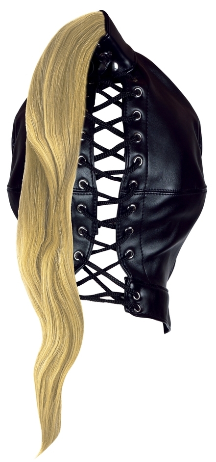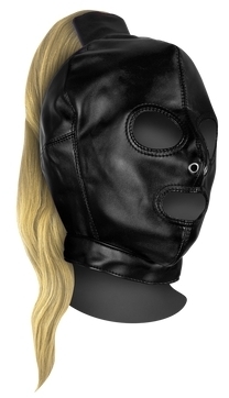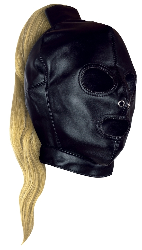 Cagoule noire avec trois ouvertures : yeux, nez et bouche. Avec une queue de cheval blonde qui sort à l’arrière. Lacets à l’arrière. En polyester et simili.