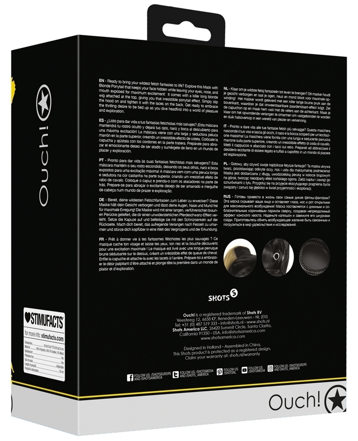 La Cagoule avec Queue de Cheval Blonde HOOD TAIL est un accessoire de la marque Ouch! Xtreme qui fera de vous une autre personne pendant vos moments SM. Vous vous transformerez pour ce jeu de rôle et découvrirez une autre facette de votre personnalité. TRANSFORMEZ-VOUS EN SOUMIS DOCILE AVEC CETTE CAGOULE QUEUE DE CHEVAL Idéale pour les novices et les experts, cette cagoule vous fera voir le jeu de domination d’une autre façon. Avec ses trois ouvertures, vous pourrez facilement voir votre partenaire et lui parler ou exprimer vos émotions. Pour les experts, vous pourrez associer cette cagoule avec d’autres accessoires SM. La cagoule est ajustable, votre tête n’aura donc aucun mal à y entrer. Les lacets à l’arrière vous permettront de le resserrer autant que nécessaire. Ce qui fera la différence avec les autres cagoules, c’est la queue de cheval blonde ! Elle mesure 55 cm de longueur.De quoi étonner votre partenaire et réveiller en lui de nouveaux fantasmes. L’accessoire est en polyester et en simili. CONSEILS D’UTILISATION Afin d’utiliser et de conserver de façon optimale votre Cagoule avec la queue de cheval, Boystore, notre shop gay en ligne, vous recommande de : La nettoyer avant et après usage au savon doux ou avec un nettoyant approprié Conserver dans un endroit sec, propre et à l’abri de la chaleur, sans contact avec un autre objet.