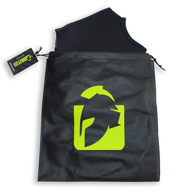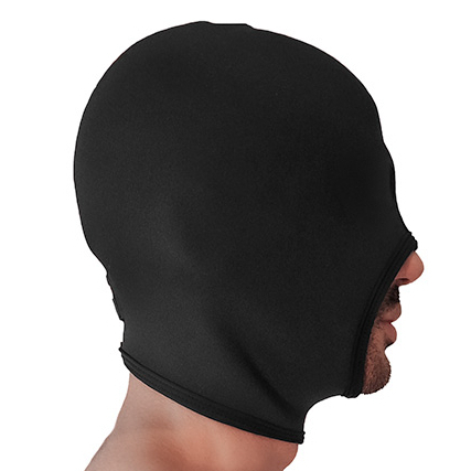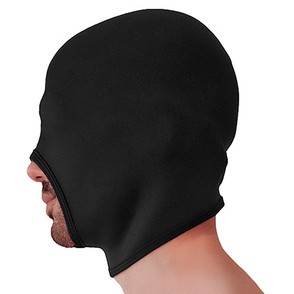 Cagoule noire en néoprène avec une ouverture à l’avant pour respirer et laisser la bouche accessible.Elle masque la vue. Hauteur : 26 cm.Tour de tête maximum : 54 cm.Tour de l’ouverture en bas : 34 à 52 cm.Hauteur de l’ouverture centrale : 11 cm. Le néoprène est légèrement étirable.