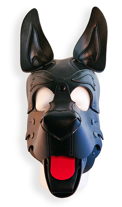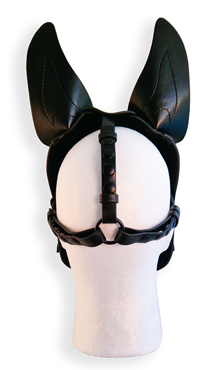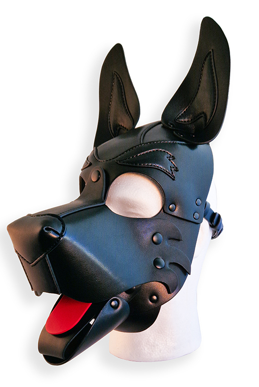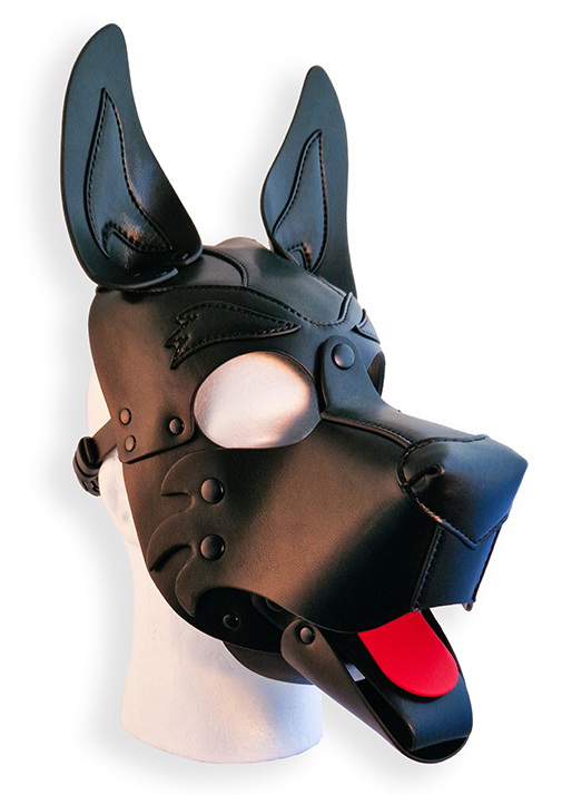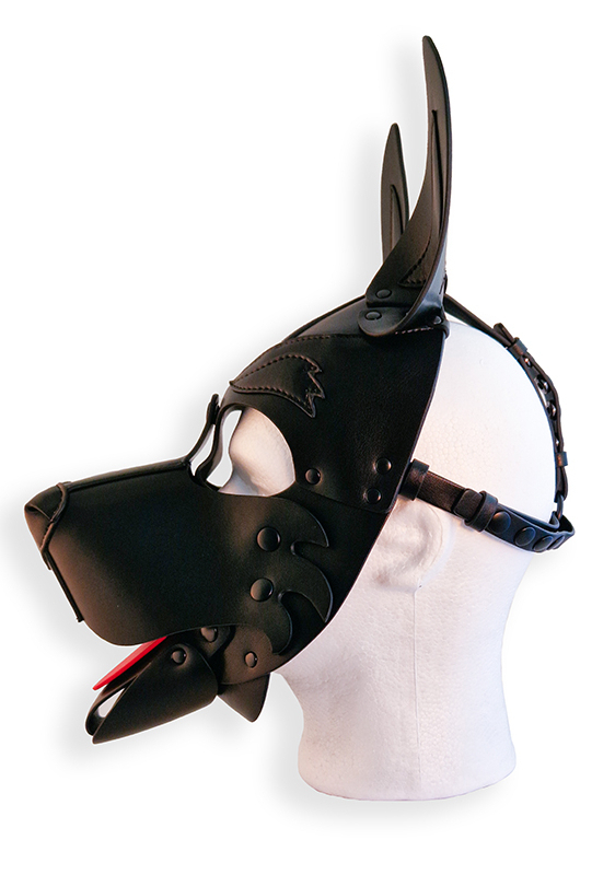 Cagoule noire avec les oreilles recourbées, le museau large et la langue rouge.Museau et langue sont amovibles. Sangles ajustables avec un tour de tête maximale de 65 cm. Dimensions : 40 x 20 x 16 cm