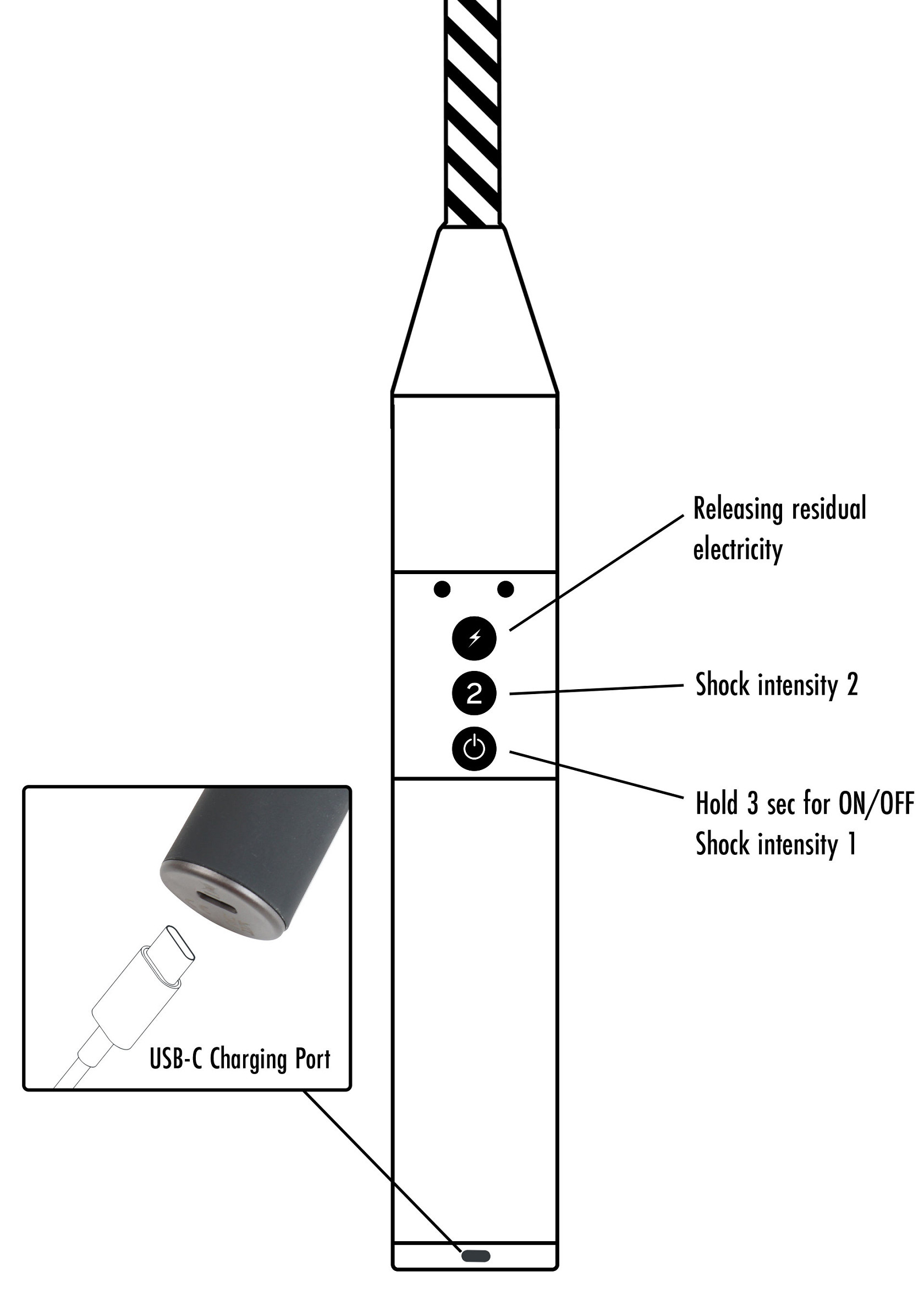 Canne de 55 cm de longueur totale avec une extrémité en métal (13 mm de diamètre).Elle envoie une impulsion électro intense et permet de mener le partenaire. Tige avec revêtement simili.Recharge USB.