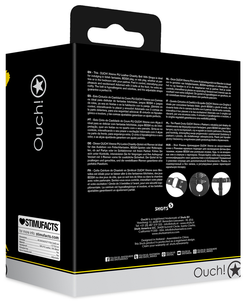 Dimensions : Tour de taille réglable de 77 à 103 cm Sangles pour le pénis de 12 à 17 cm Anneau pénien de 40 mm de diamètre.