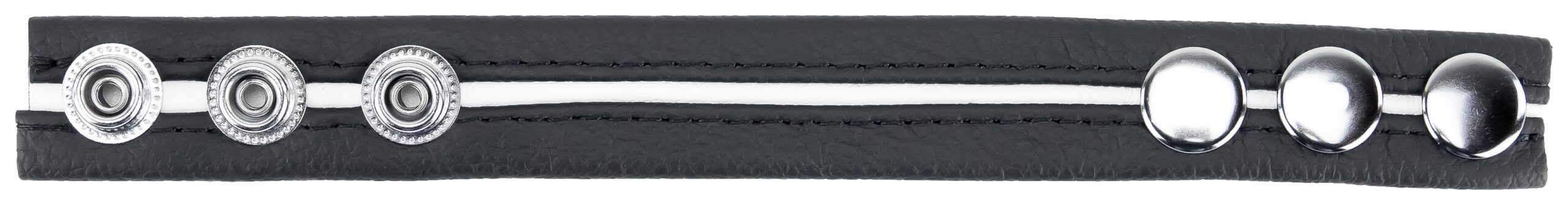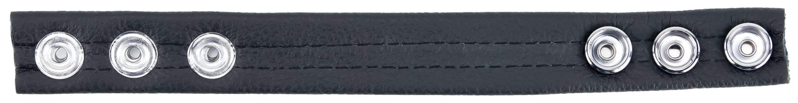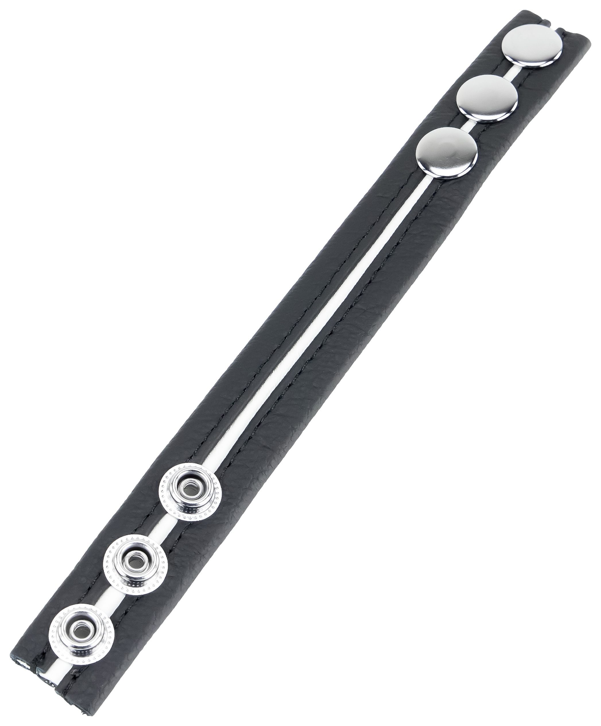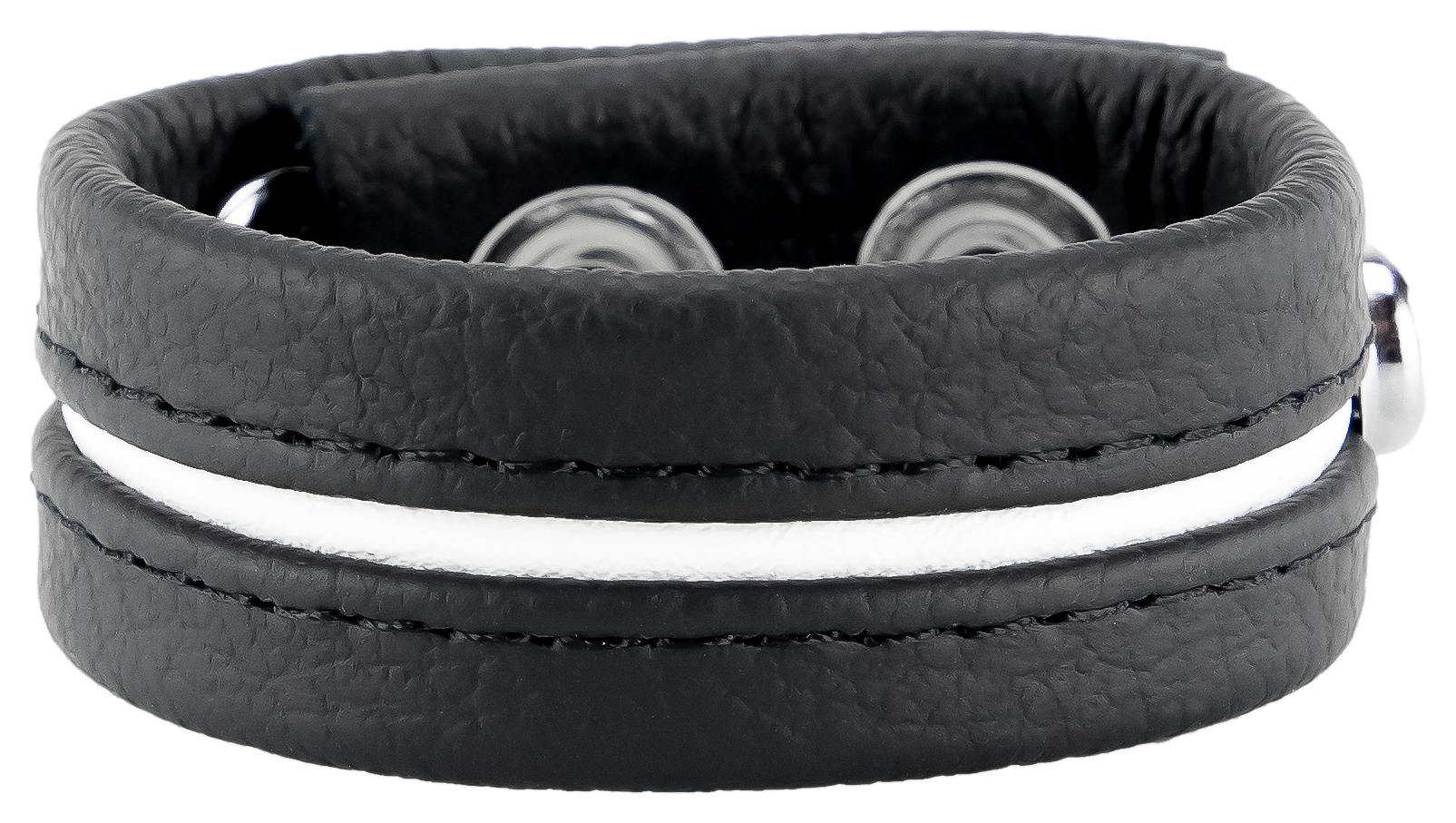 Ce cockring en cuir noir est conçu avec une ligne blanche au centre et 3 pressions métalliques pour ajuster le diamètre de serrage.Celui-ci va de 30 à 55mm. Largeur de 22mm. En cuir véritable de vache. Tannage végétal.Fabriqué en Europe
