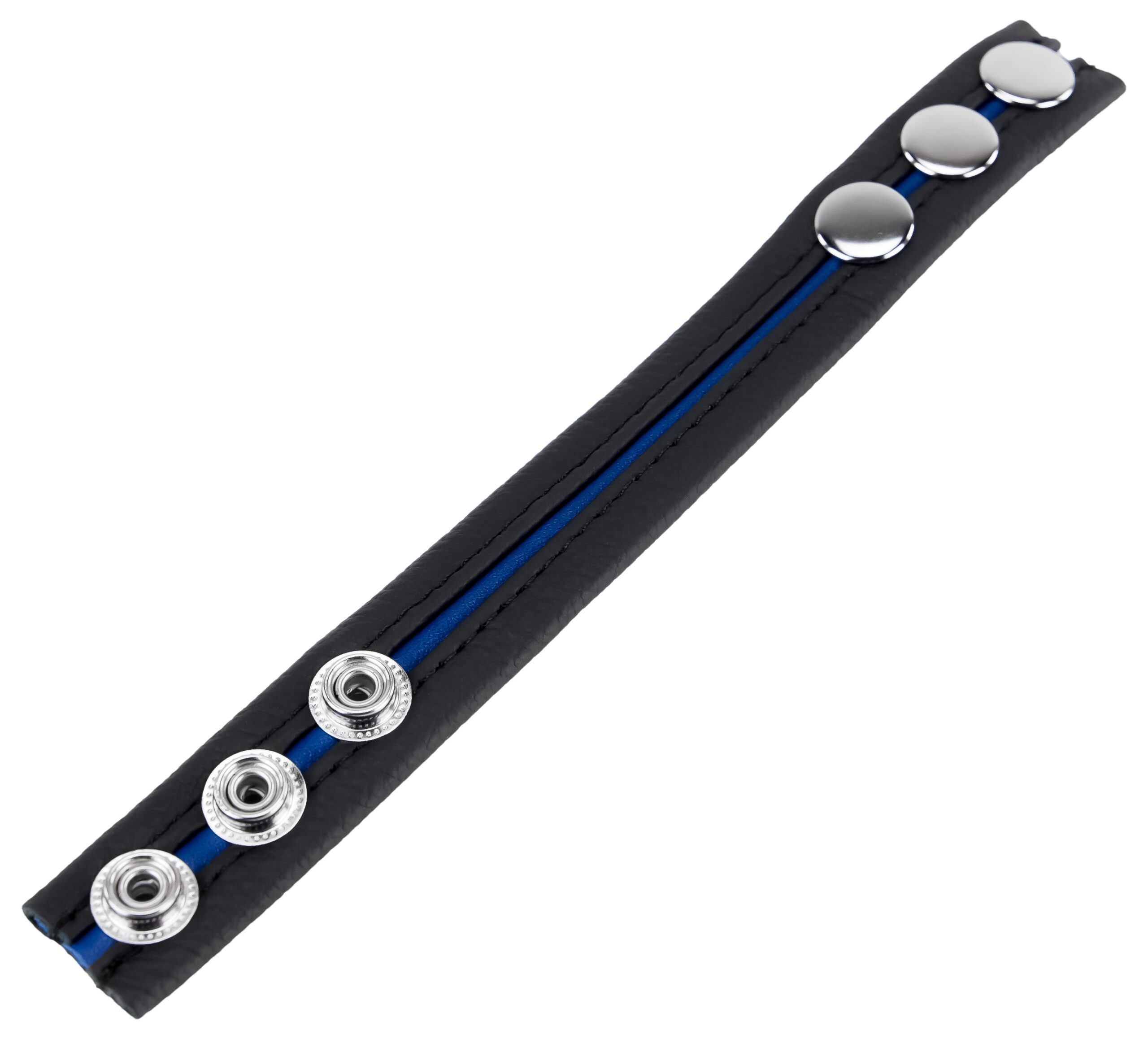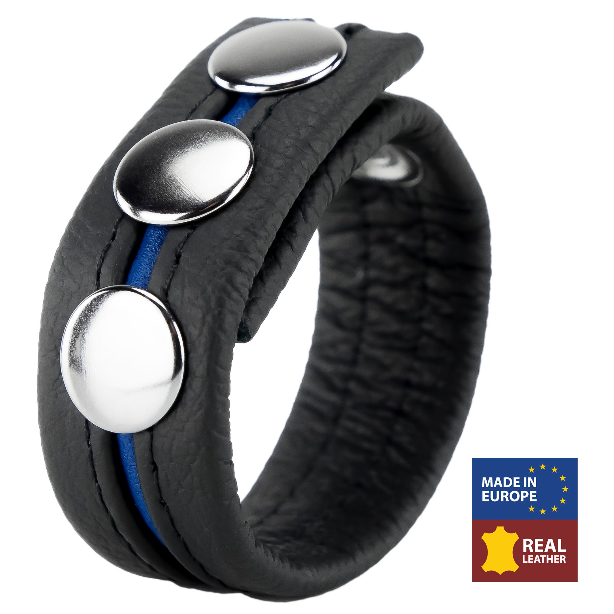 Ce cockring en cuir est un sextoy idéal pour garder une érection puissante. Il se place à la base du sexe et le serrer pour rendre les sensations intenses.Il se compose d’une largeur de 22mm avec une ligne bleue centrale. Les 3 pressions en métal permettant d’ajuster le diamètre de serrage de 30 à 55mm. En cuir véritable de vache. Tannage végétal.Fabriqué en Europe