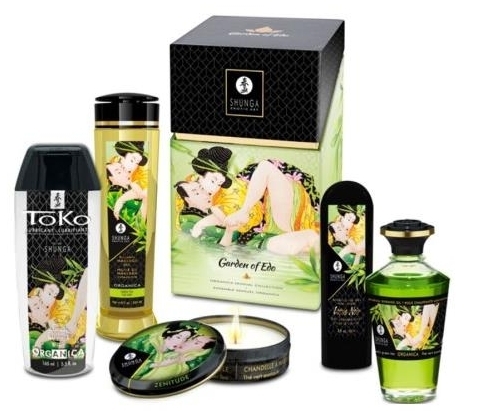 Coffret d’un Ensemble de 5 produits Shunga comprenant : une huile de massage délectable Organica une huile chauffante aphrodisiaque une bougie de massage Zénitude un lubrifiant Toko Organica et un gel sensibilisant pour le couple