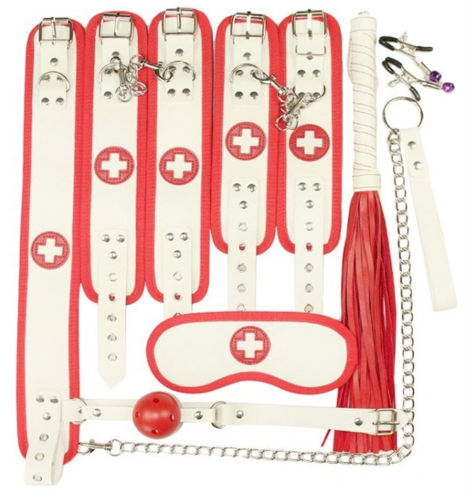 Ce coffret est idéal pour les envies d’infirmerie. En effet, la plupart des accessoires sont réalisés avec une croix rouge sur fond blanc. Accessoires conçus en simili.Le pack comprend : un masque des menottes un collier-laisse un baillon-boule des pinces pour tétons un martinet