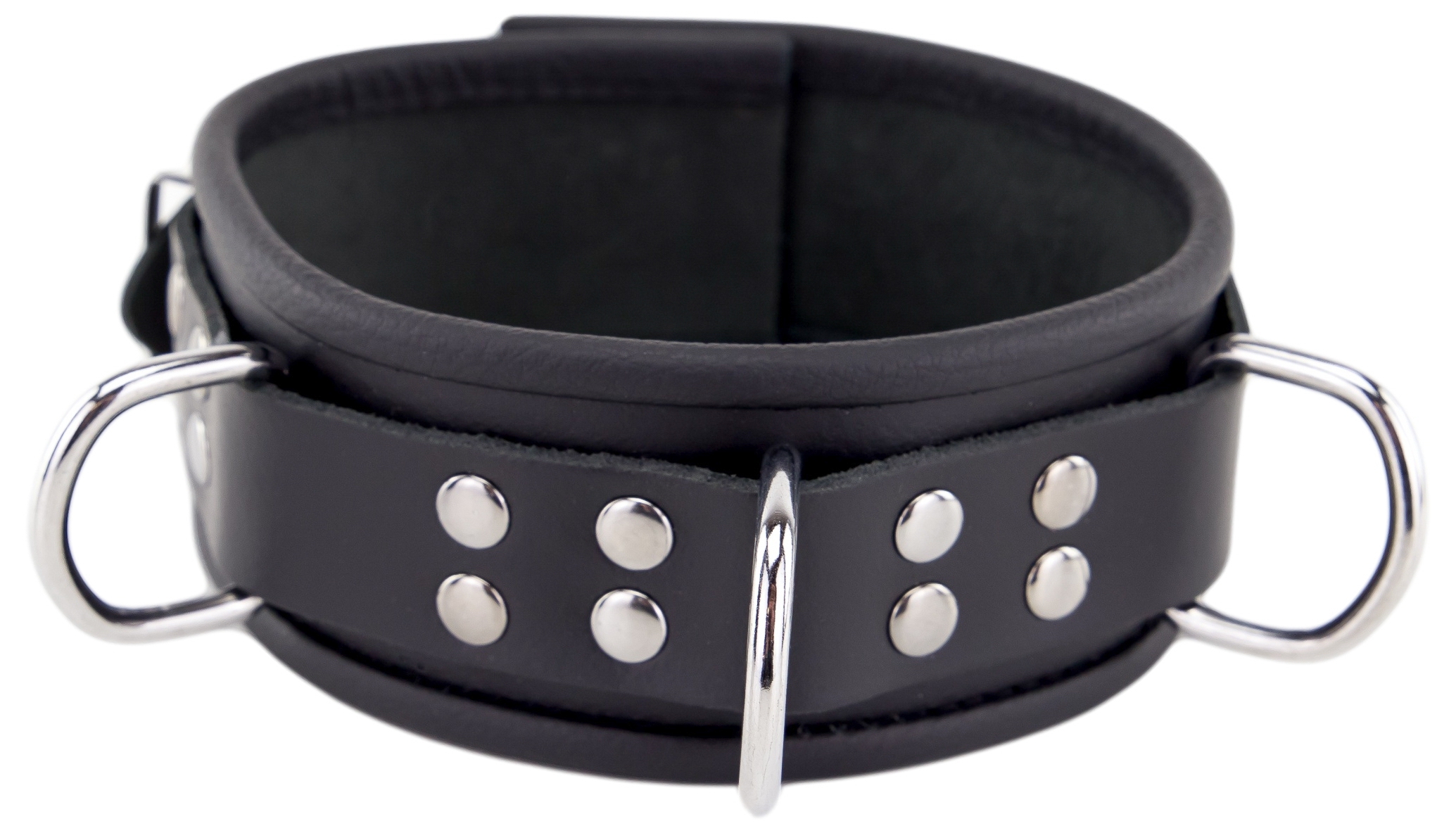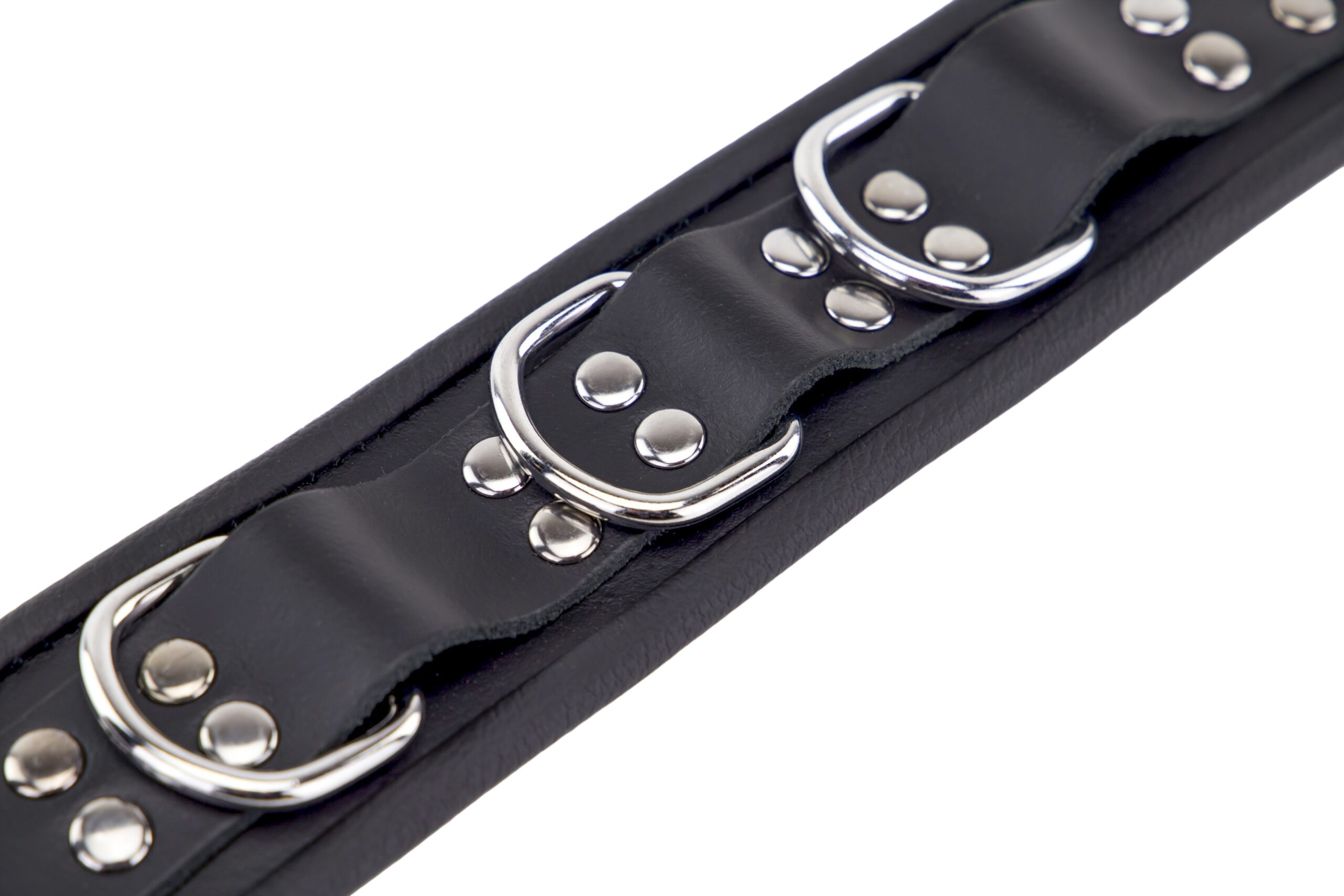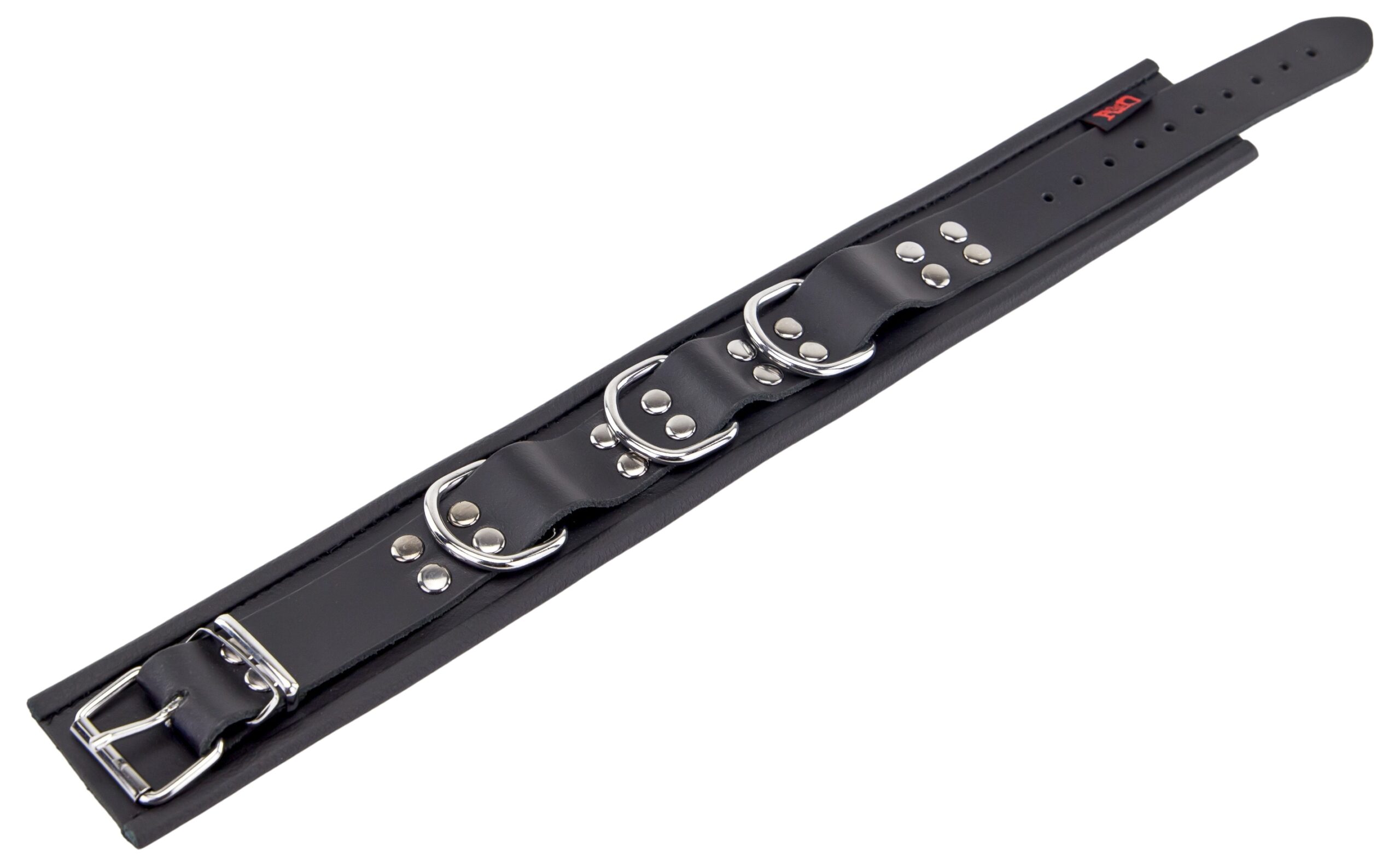 Ce collier en cuir est proposé par la marque The Red. Il est conçu avec une largeur de 6cm, des rivets métalliques et 3 anneaux en métal en forme de D.Le tour de cou va de 38 à 53cm. Il est fabriqué en cuir véritable de vache