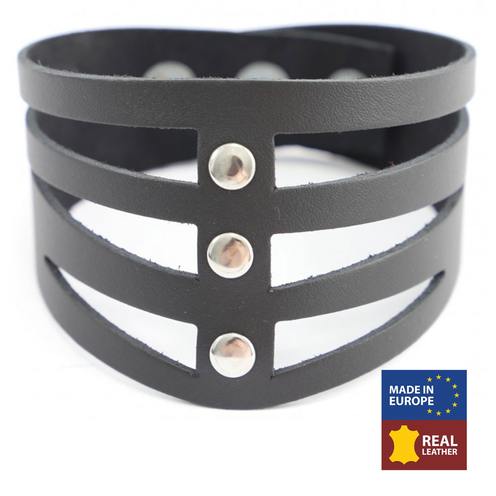 Ce collier en cuir est un accessoire de la marque The Red permettant de donner un look SM.Il se compose d’une forme en pointe avec des bandes de cuir et des rivets en métal. Le tour de cou va de 28 à 40cm. Fabriqué en cuir véritable de vache
