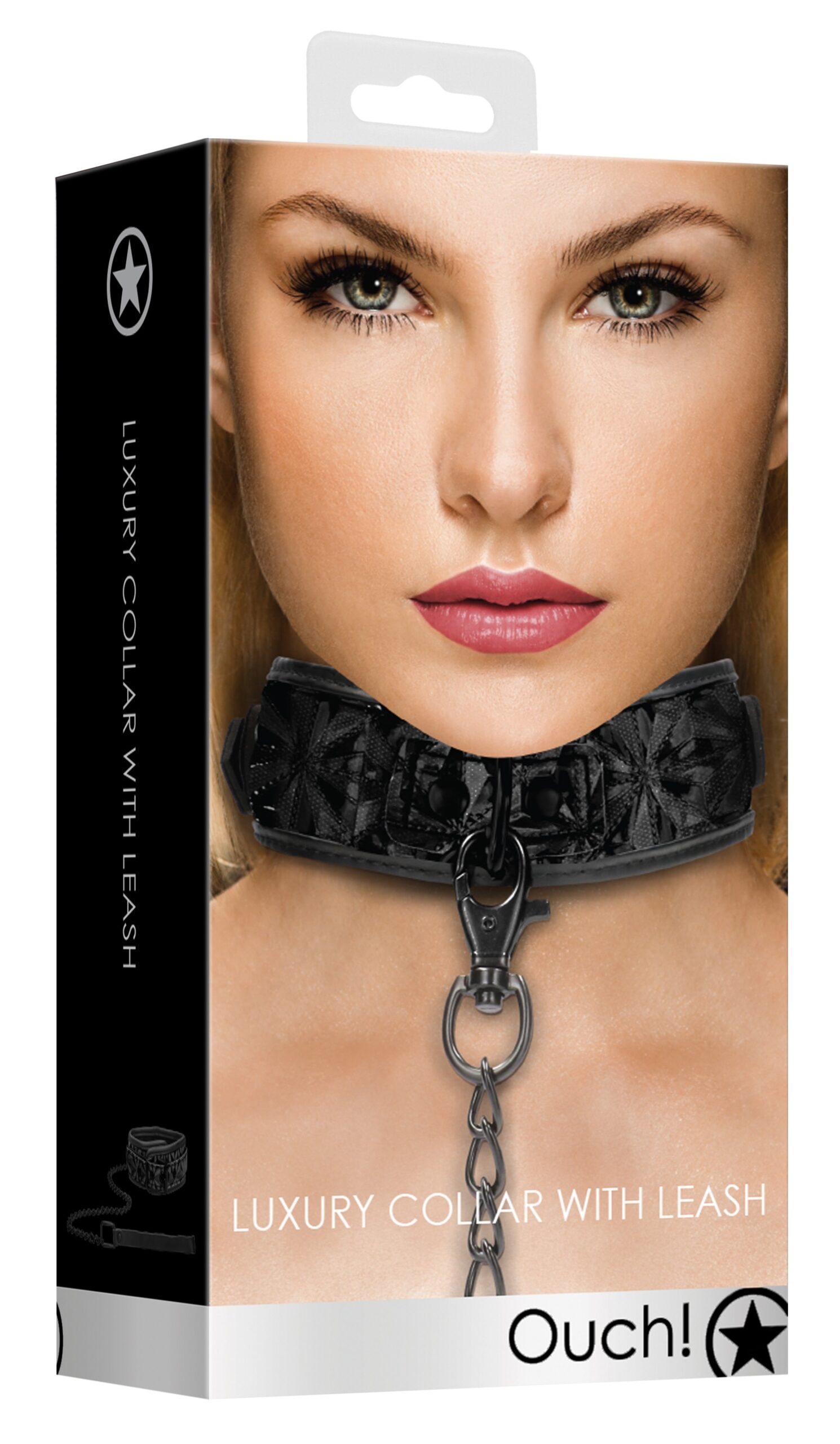 Ce collier et laisse de la gamme Luxury est proposé par la marque Ouch!. Il est idéal pour mener le partenaire comme bon vous semble.Il est composé d’un collier de 5cm de large et de 52cm de long ajustable au tour de cou. La surface est brillante.La chaîne est en métal et mesure 80cm de long. Fabriqué en vinyle, simili cuir et néoprène