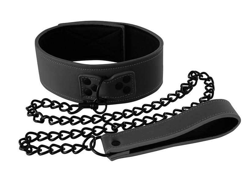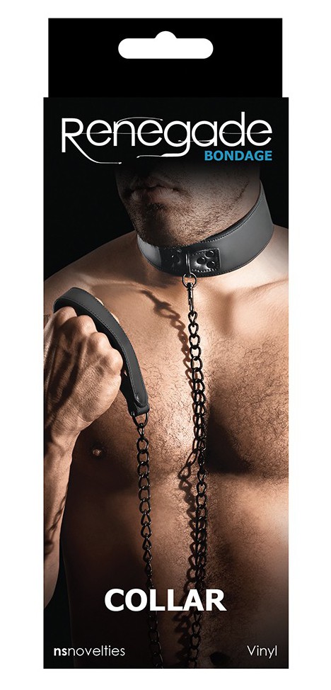 Cet accessoire SM de la marque Renegade est composé de: un collier de 5cm de large se fixant par scratch une laisse métallique de 80cmde long avec une poignée. Cet élément est réalisé en simili cuir