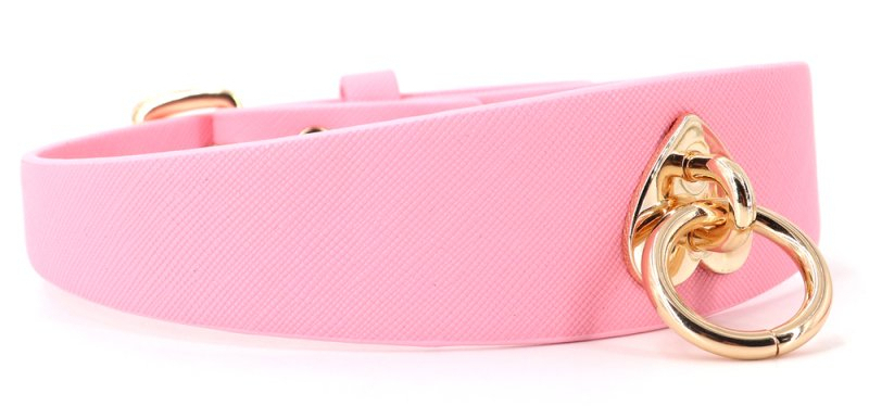 Collier-laisse, de couleur rose, avec attaches dorées.Longueur ajustable de 33 à 42 cm et largeur maximale de 4 cm.Laisse de 87 cm.En simili.