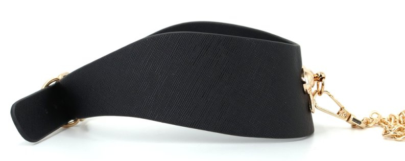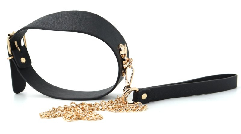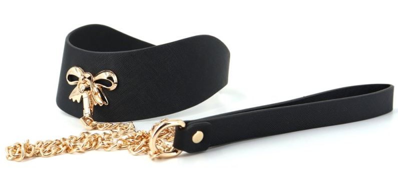 Collier, noir, avec un noeud en métal doré, et sa laisse de 87 cm.Longueur ajustable de 40 à 46 cm et largeur maximale de 5 cm.En simili noir.