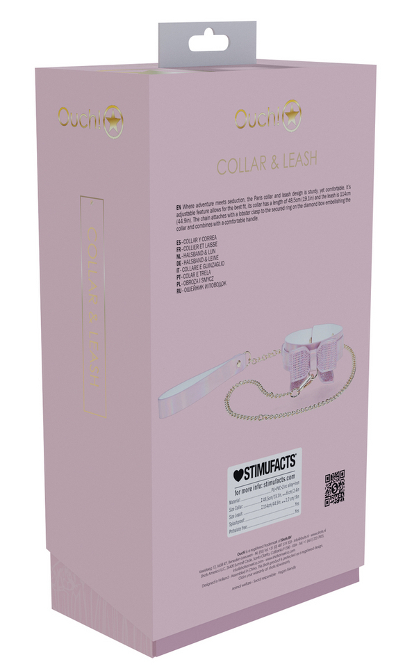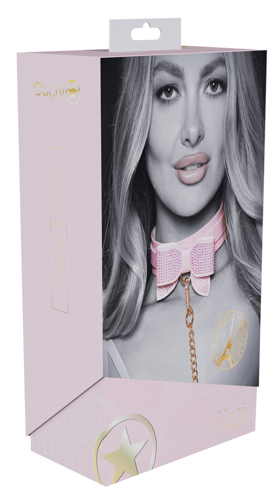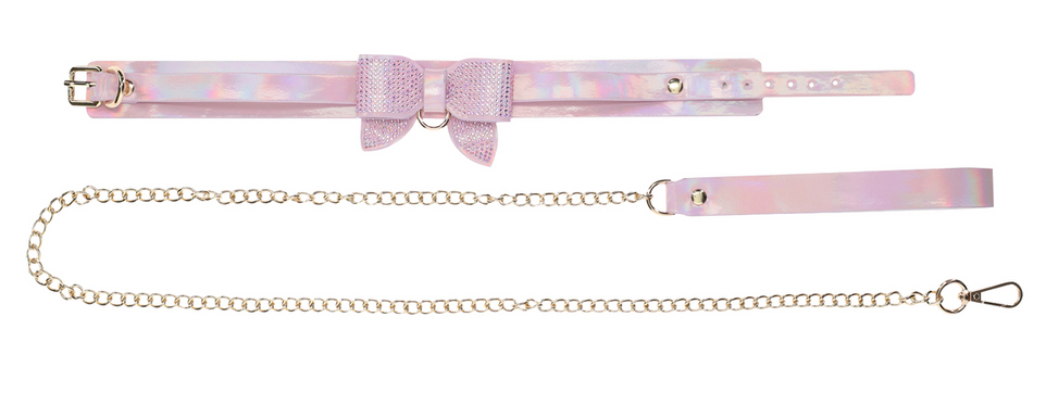 Collier-laisse avec un gros noeud à l’avant, recouvert de brillants. Longueur ajustable de 36 à 43 cm et largeur de 3.5 cm. Laisse de 98 cm. En simili rose pâle irisé.