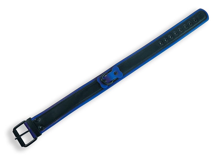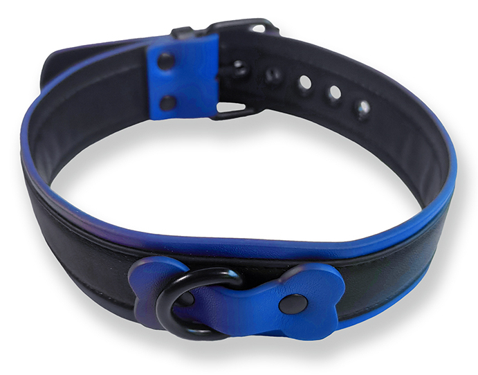 Collier noir avec des bordures bleues et une largeur de 3.7 cm.Ave un os central qui maintient l’anneau. Tour de cou de 38 à 49 cm. En simili (polyuréthane)