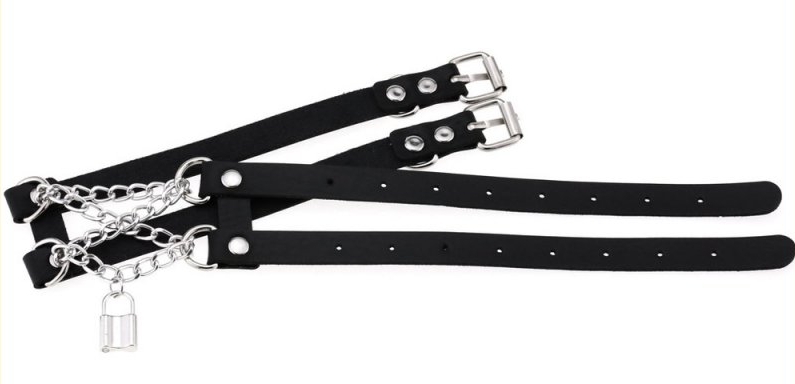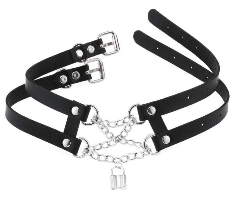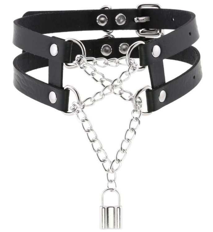 Ce collier ras de cou Pendant Lock apporte un style élégant grâce aux 2 bandes fines en simili et à la chaîne en métal avec un pendentif au bout.La larguer du collier est de 4cm. Avec un tour de cou de 30 à 44cm. En simili