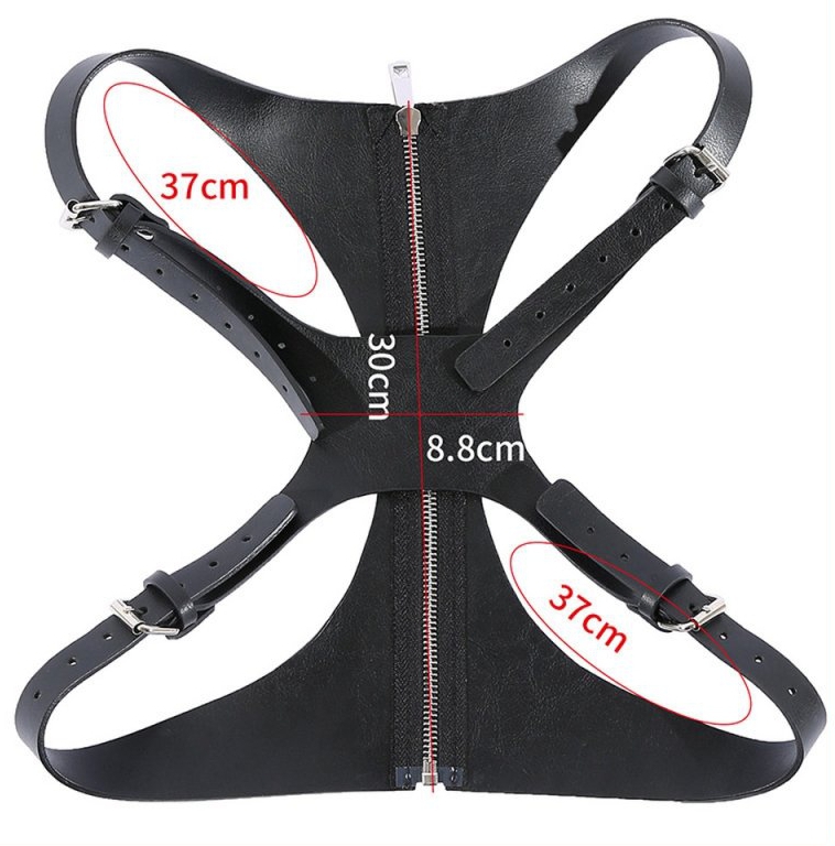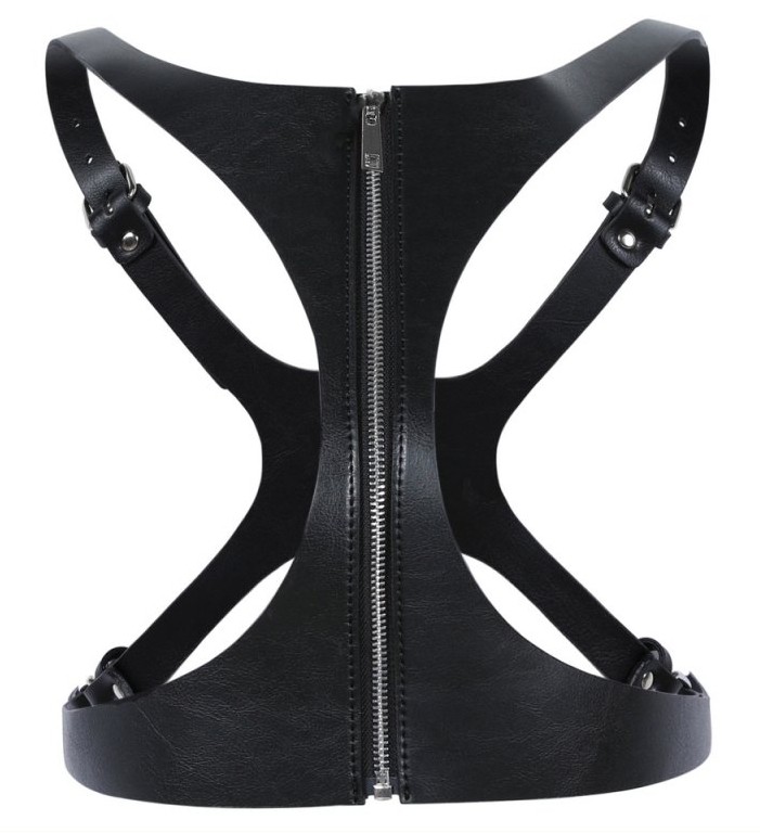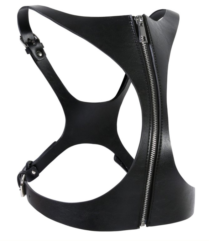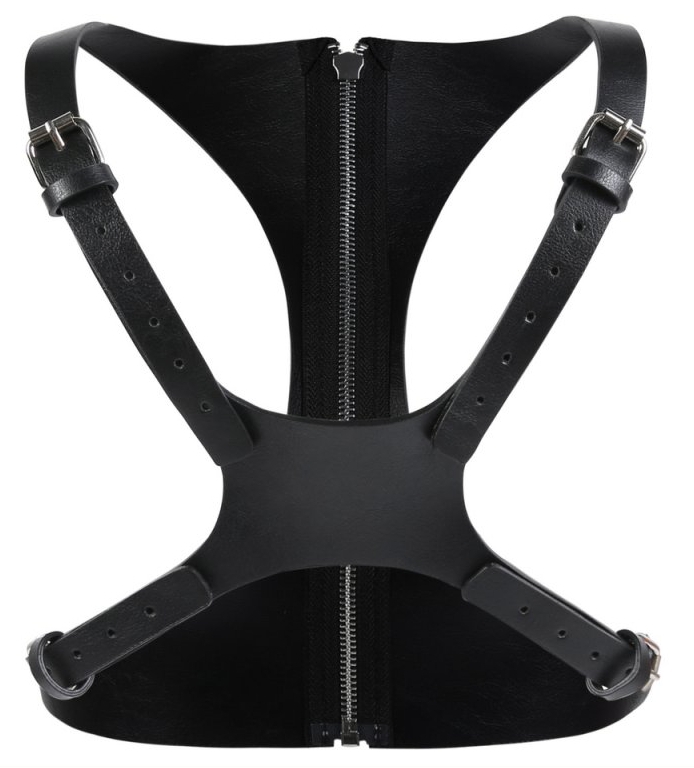 Cet accessoire en vinyle noir est un corset Sm se plaçant sur le buste. Avec des sangles ajustables. En polyuréthane
