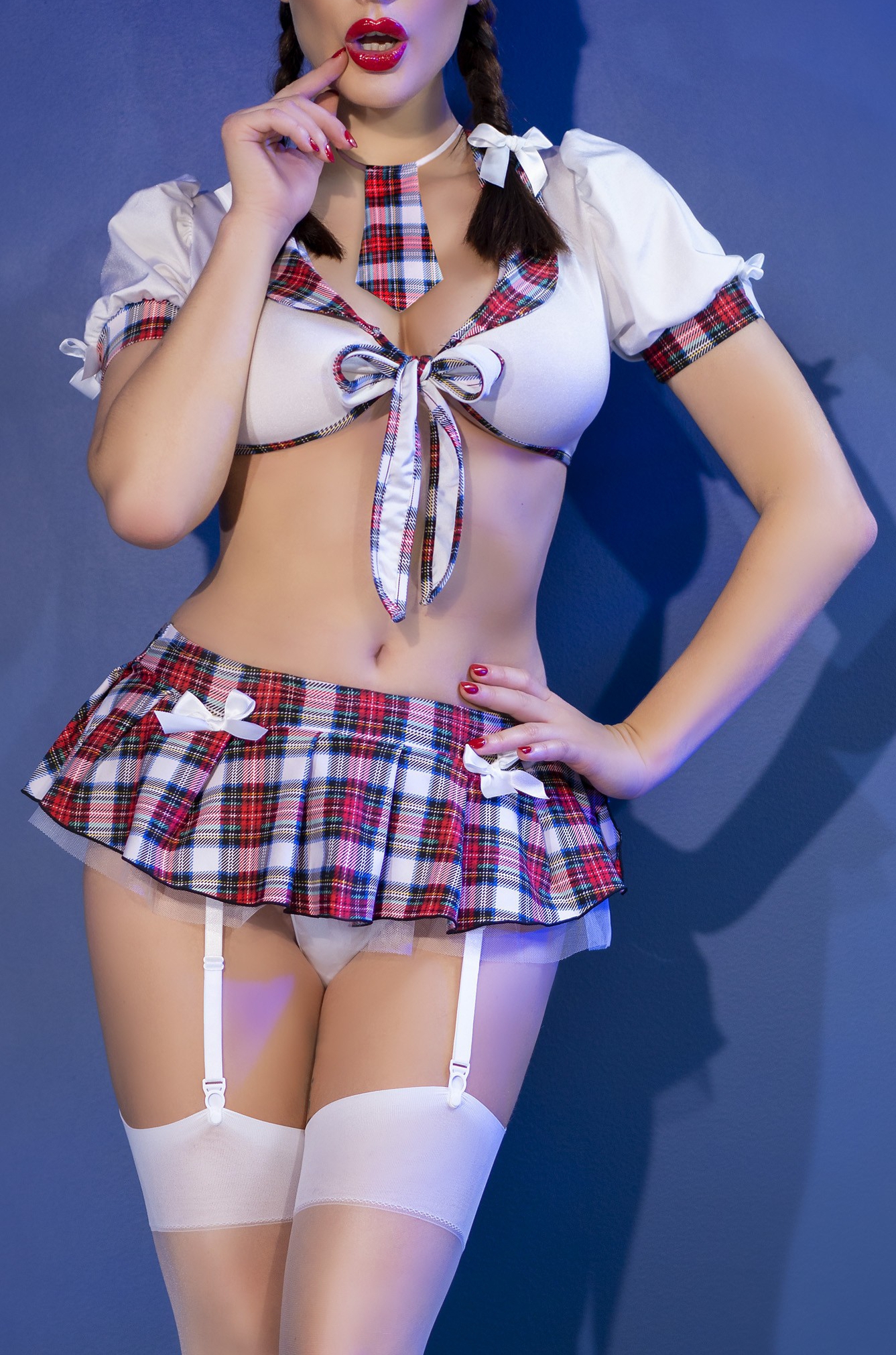 Ce costume d’écolière est composé de : le haut se laçant sur la poitrine la cravate la jupe avec porte-jarretelles les bas le noeud pour les cheveux le string. Composition : 90% Polyamide, 10% Élasthanne
