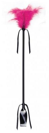 Cravache et plumeau en un seul accessoire. un côté cravache, longue de 8 cm pour une largeur de 3.5 cm un côté plumeau, avec 20 plumes de couleur fuchsia une tige en plastique de 30 cm