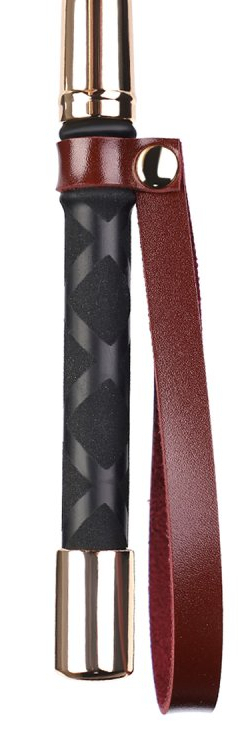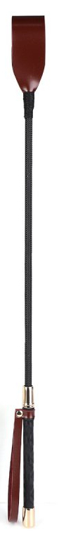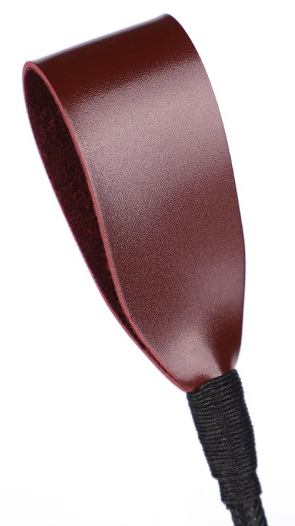 Cravache avec un manche rigide. Longueur totale de 59 cm dont une partie souple de 9 cm de long pour 3.8 cm de large. En simili