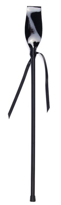 Cravache noire, légère et rectangulaire. une surface de contact de 8 cm de long pour 3.5 m de large un petit ruban de satin entre la tige et la cravache une tige en plastique de 27 cm de long