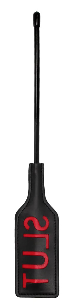 Cravache noire avec mot SLUT qui s’imprimera sur la peau de votre partenaire Longueur totale de 31.5 cm. Largeur de 5 cm. En simili noir