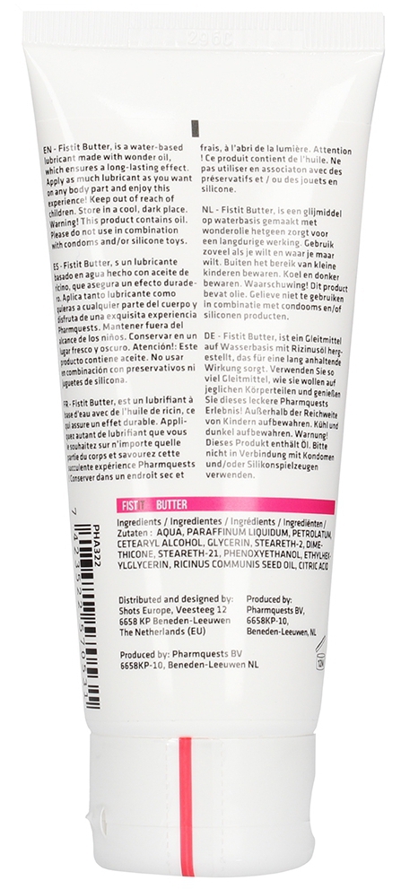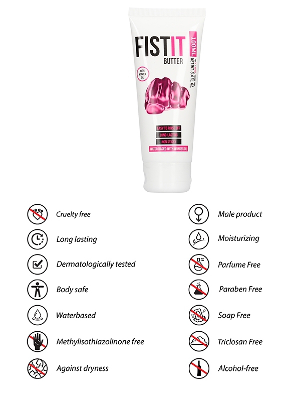 Cette crème lubrifiante Fist It Butter est idéale pour les insertions anales. Elle possède une texture souple qui s’applique facilement et qui donne une lubrification optimale. Très haut pouvoir de glisse pour des pénétrations intenses.Formule à base d’eau, de silicone et d’huile de ricin.Non collante et longue durée. Non compatible avec les préservatifs