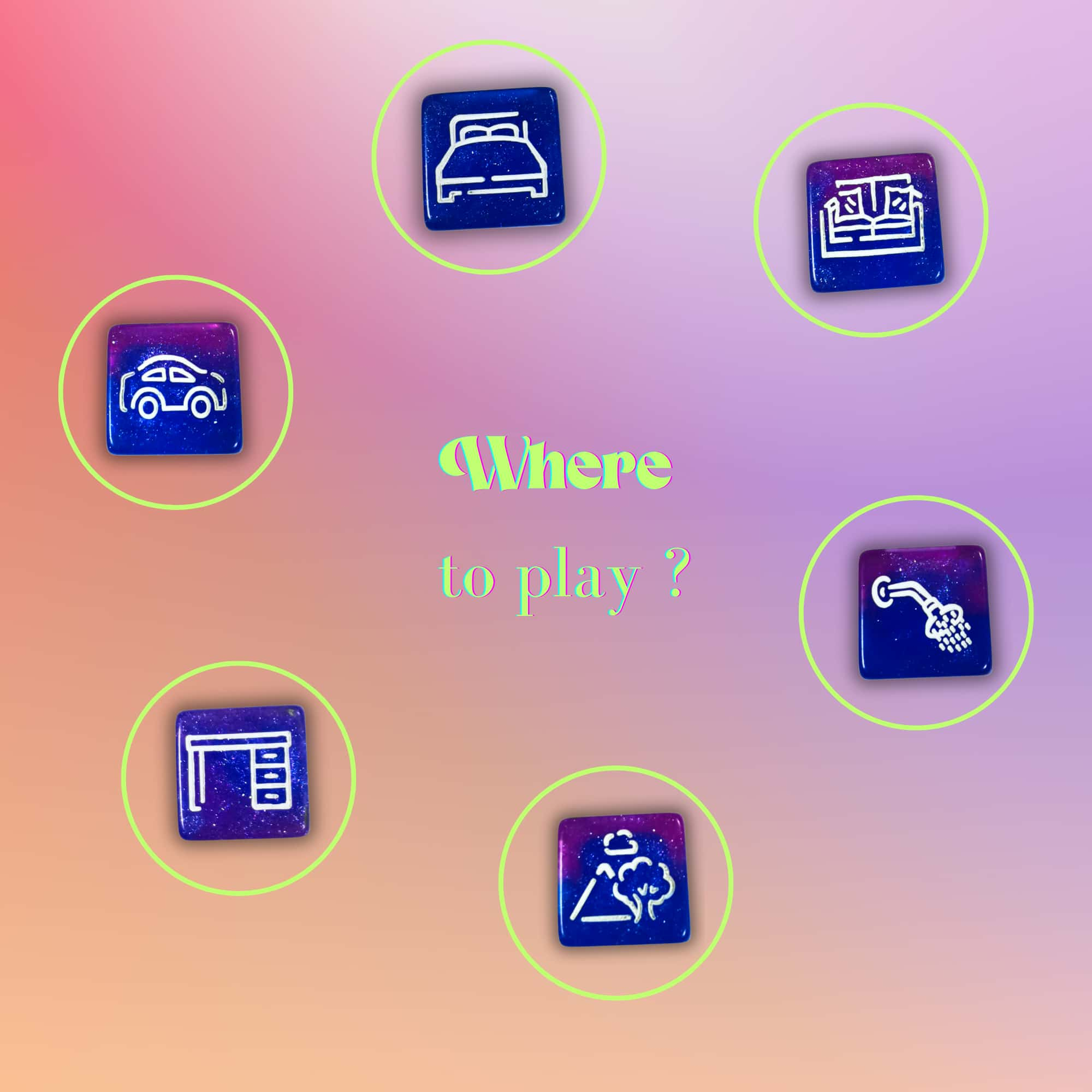 3 dés à jouer pour des soirées coquines : endroit, partie du corps à toucher et partie du corps à utiliser. Emballage recyclable en accroche-porte.