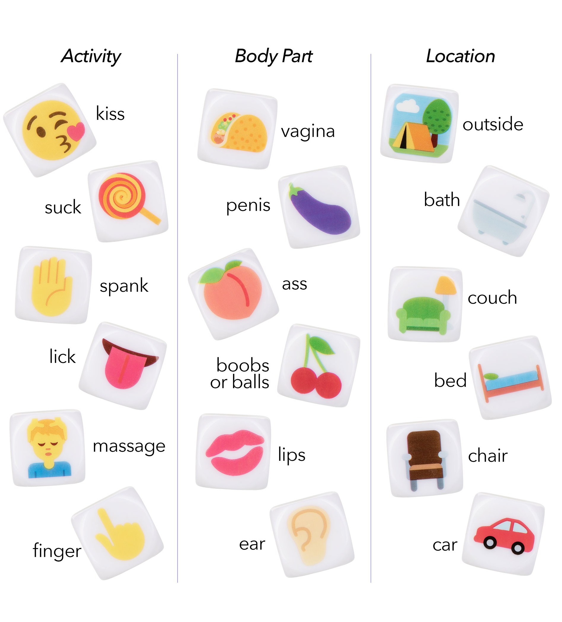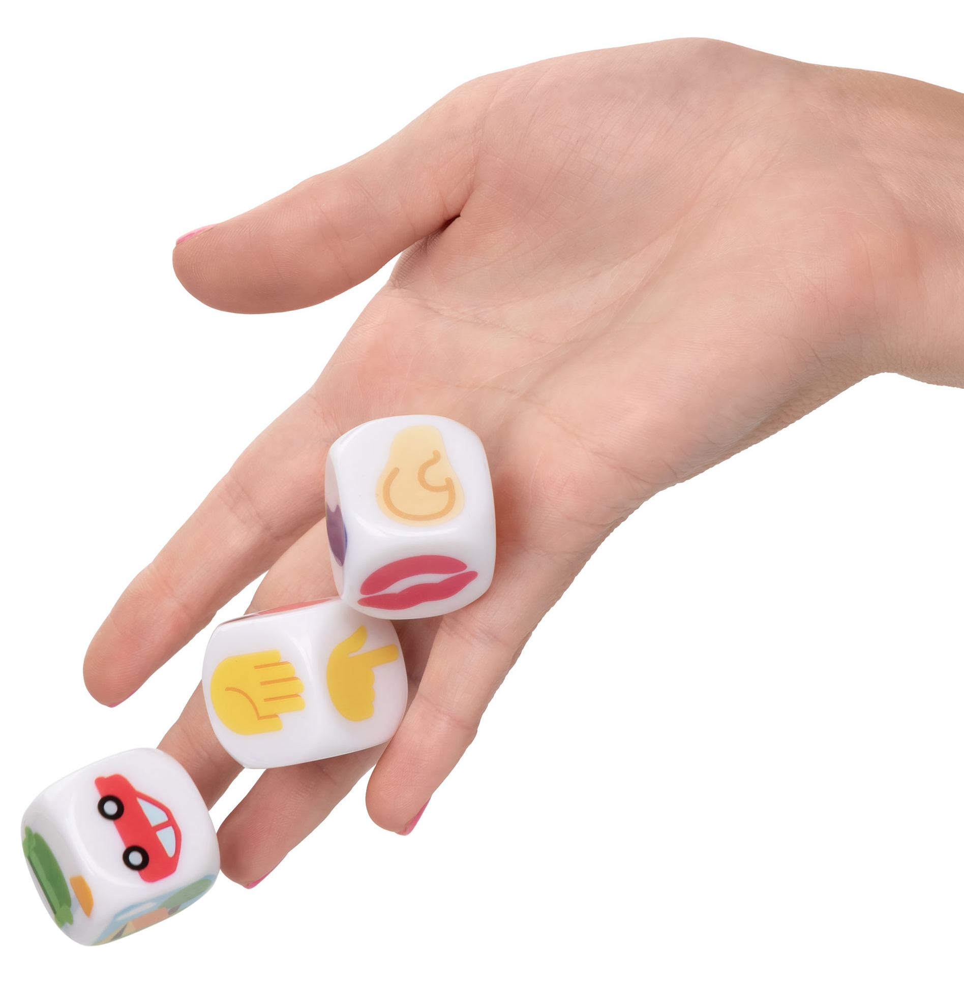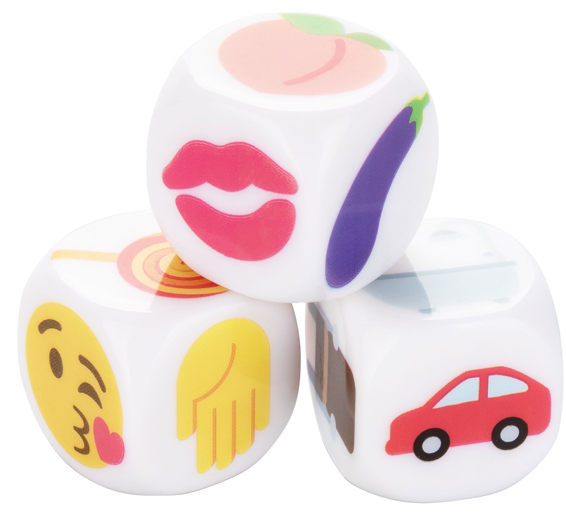 Ces 3 dés coquins sont conçus avec des figures émoji pour apporter du fun.Ils permettent de s’amuser en mêlant des actions à réaliser sur des parties du corps, dans des lieux variés et de telle ou telle manière.Vous pouvez interpréter le défi de façon très excitante