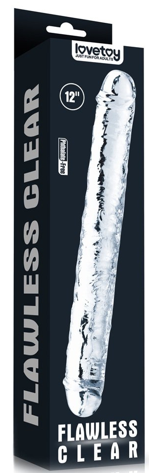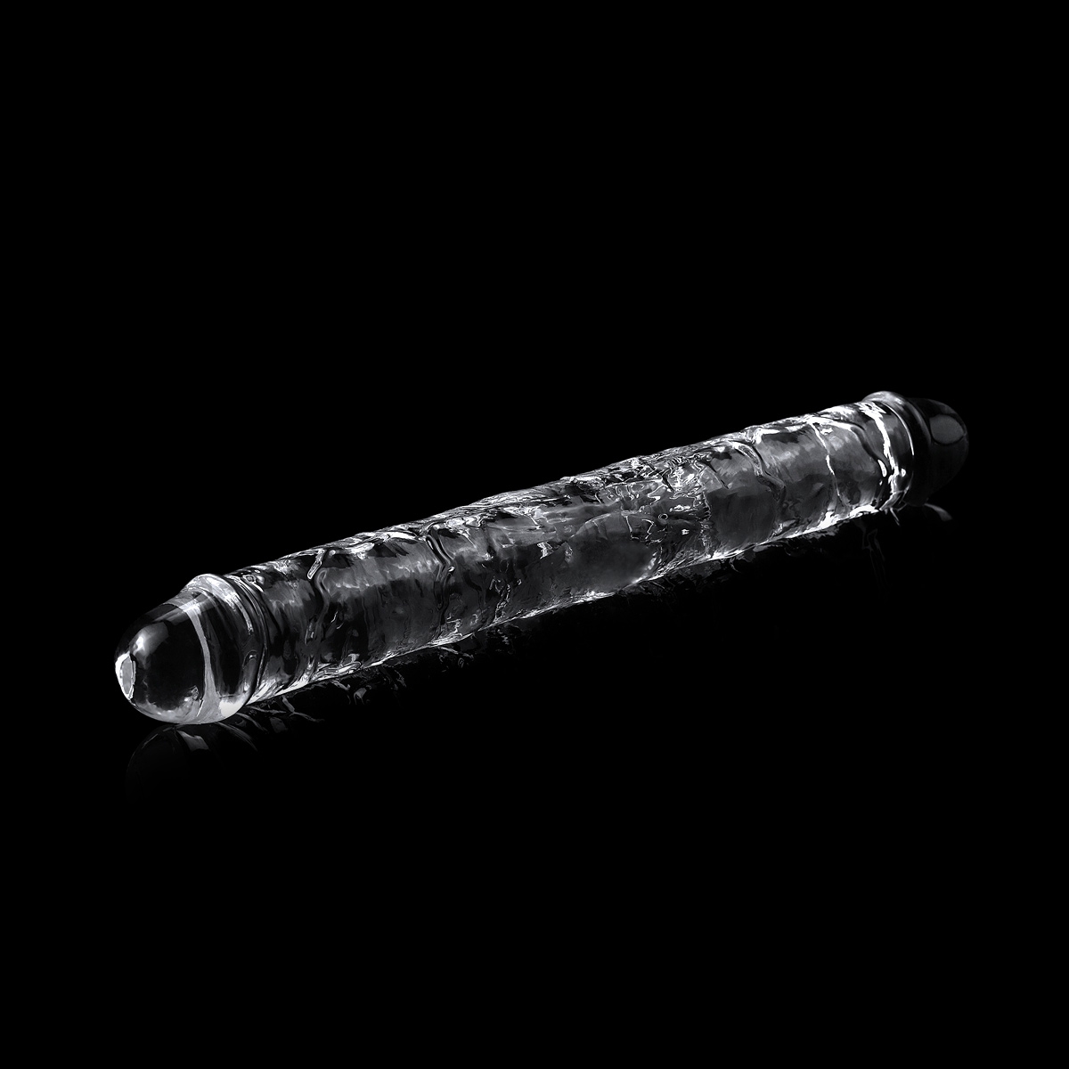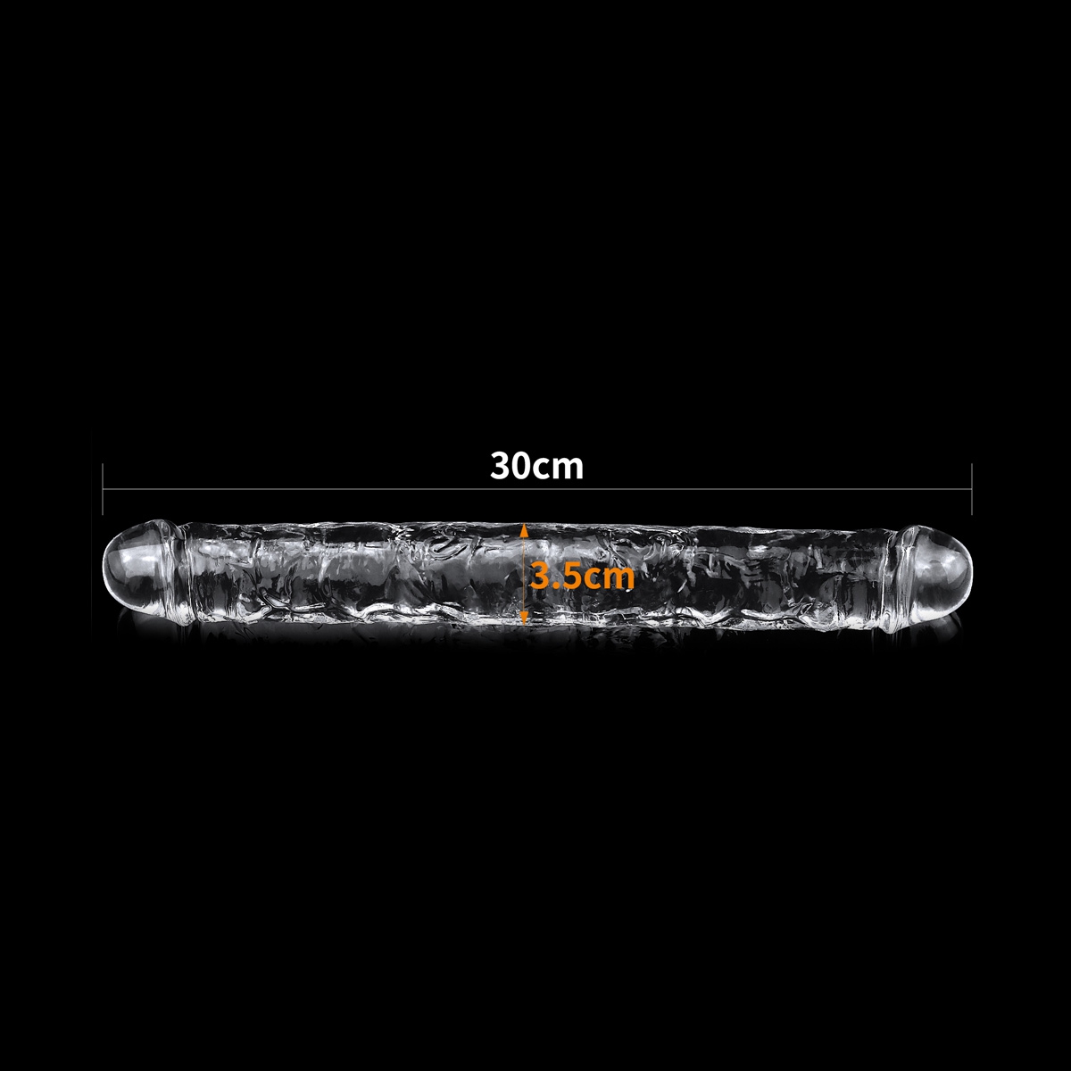 Ce sextoy transparent est un double gode conçu avec une longueur de 30cm et une largeur de 3.5cm.Il est idéal pour jouer en solo ou à deux.La surface est veinée et la structure est souple. Matière TPE