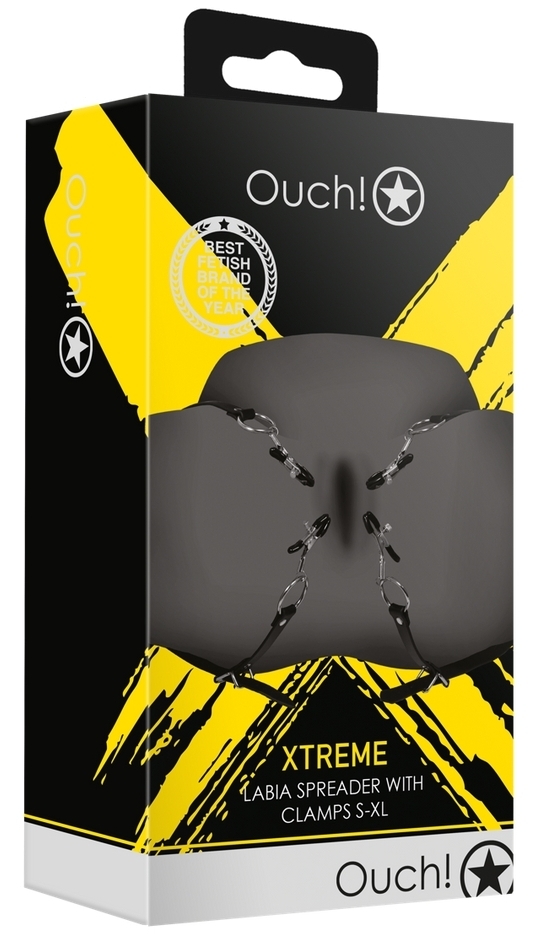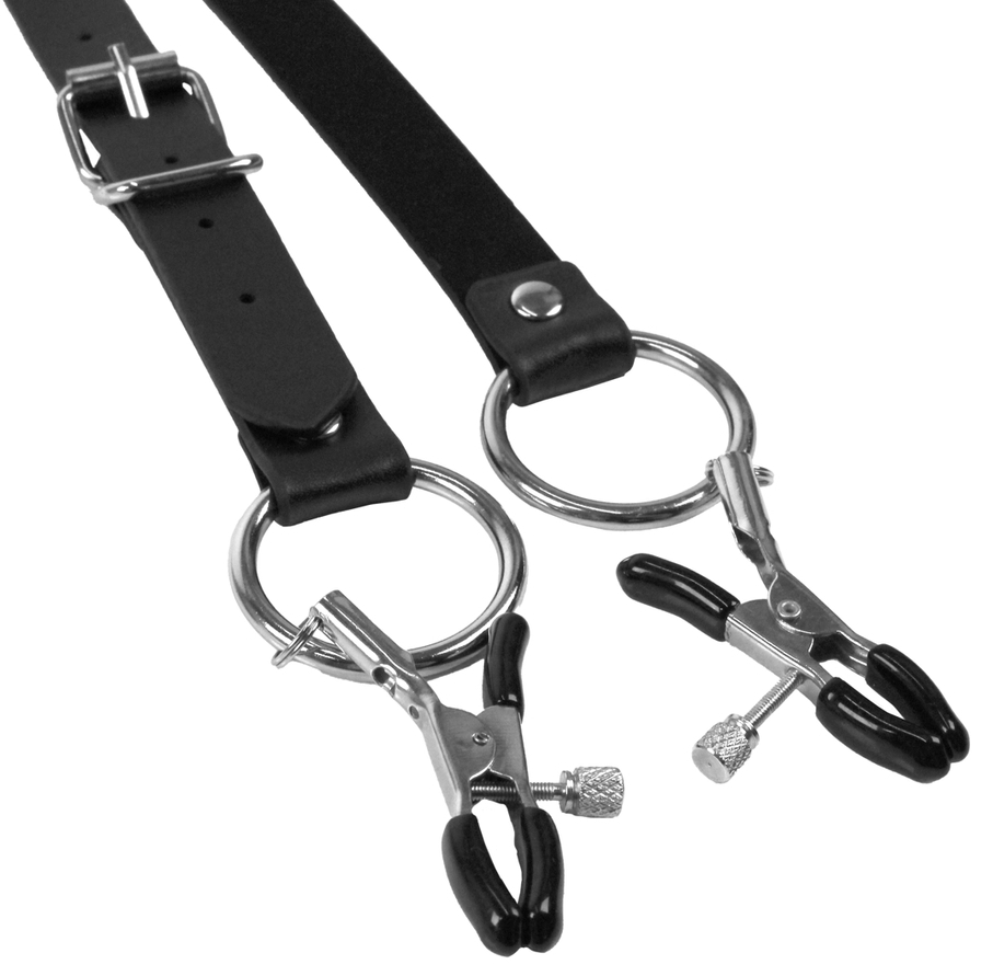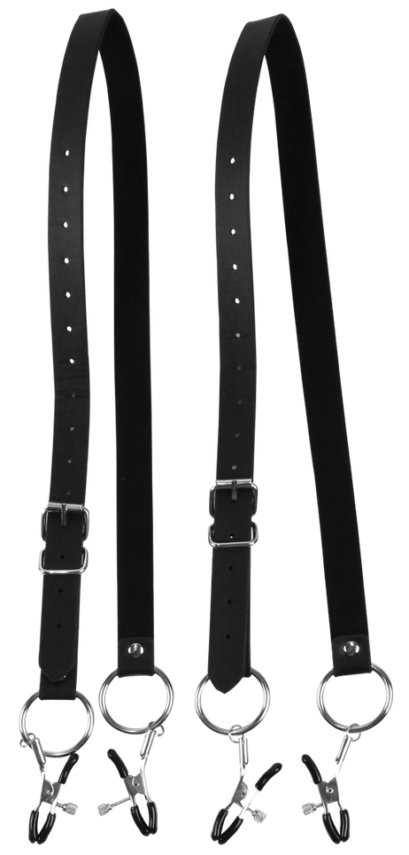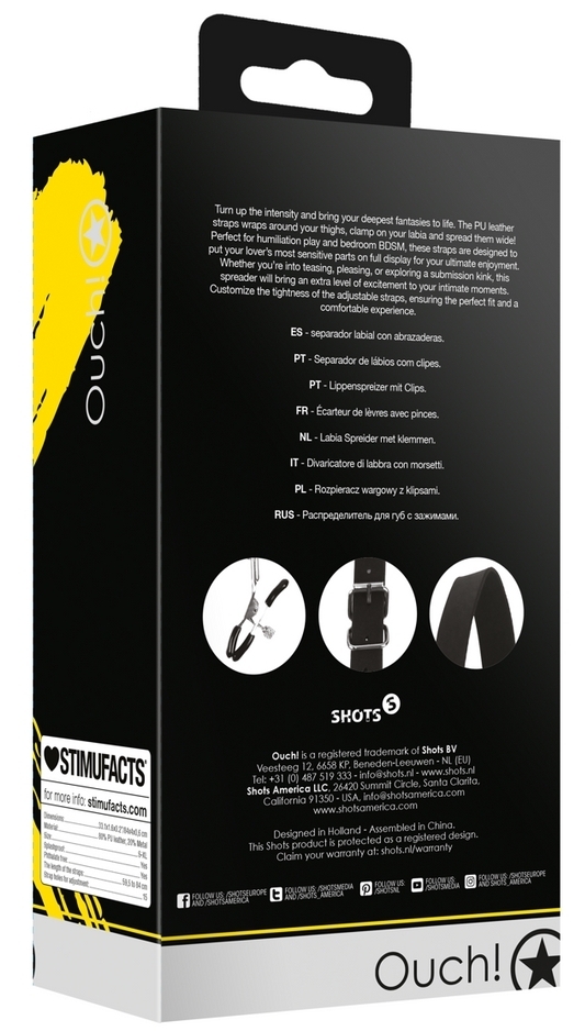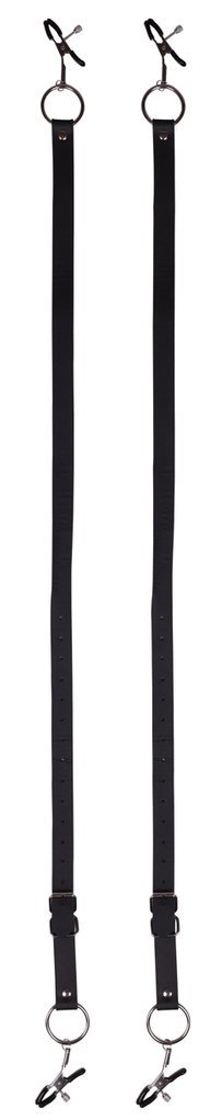 Écarteurs de lèvres vaginales avec pinces. Sangles ajustables autour des cuisses. Dimensions : Longueur des sangles de 53 à 78 cm. Largeur de sangles de 2 cm. En simili.