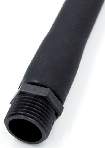 Embout de douche avec une longueur insérable de 15 cm.La largeur est de 2 cm. La surface est lisse. Fixation directe sur le flexible de la douche. En silicone