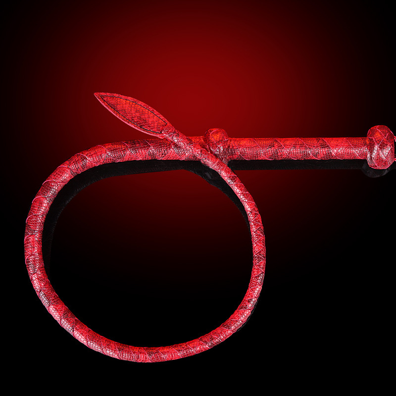 Fouet avec une poignée de 15 cm et une queue de 71 cm. En simili rouge, toucher peau de serpent.
